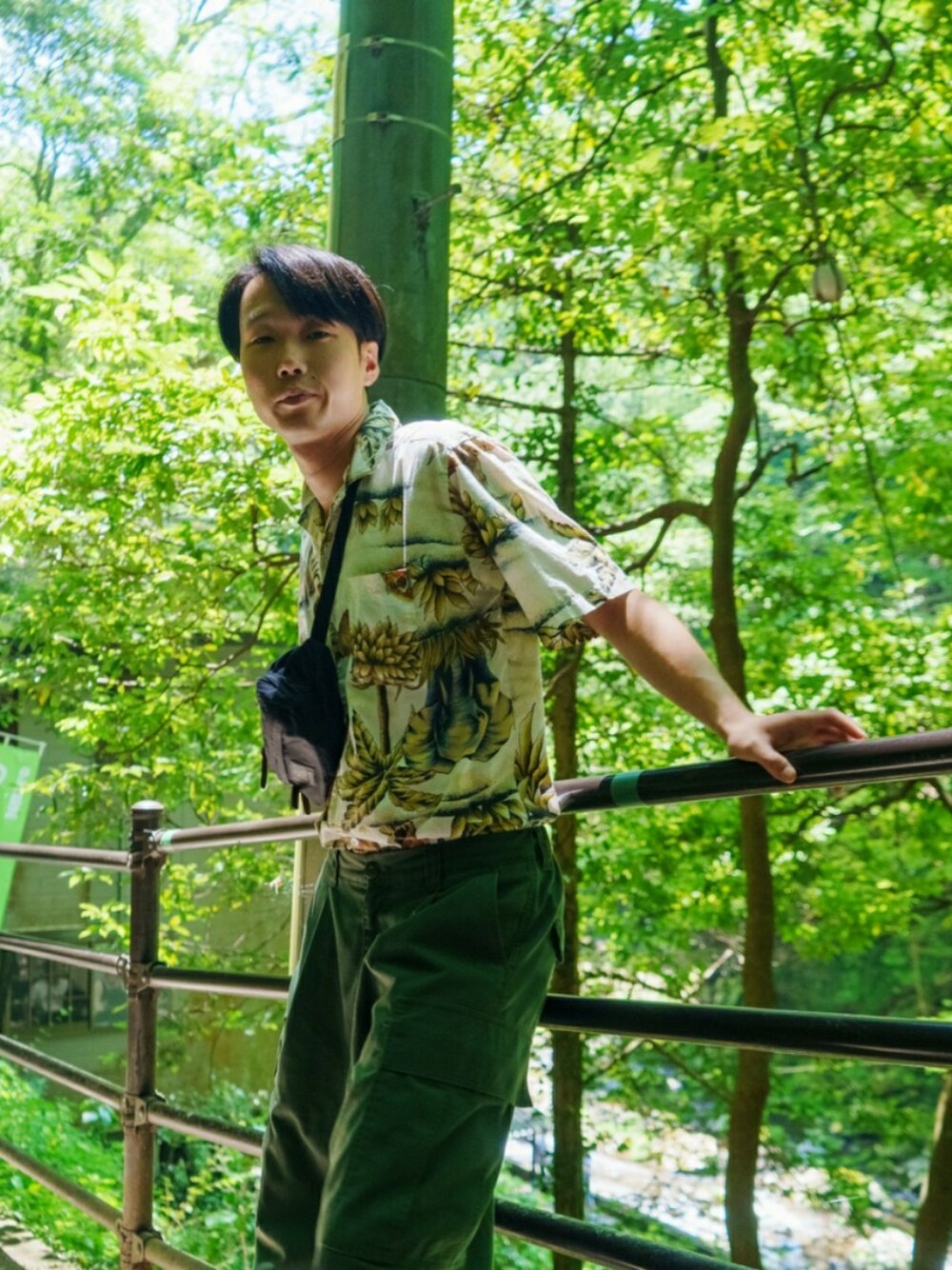 ブラック系のショルダーバッグ、グリーン系のカーゴパンツを着用したメンズの夏コーディネートの1枚目の写真