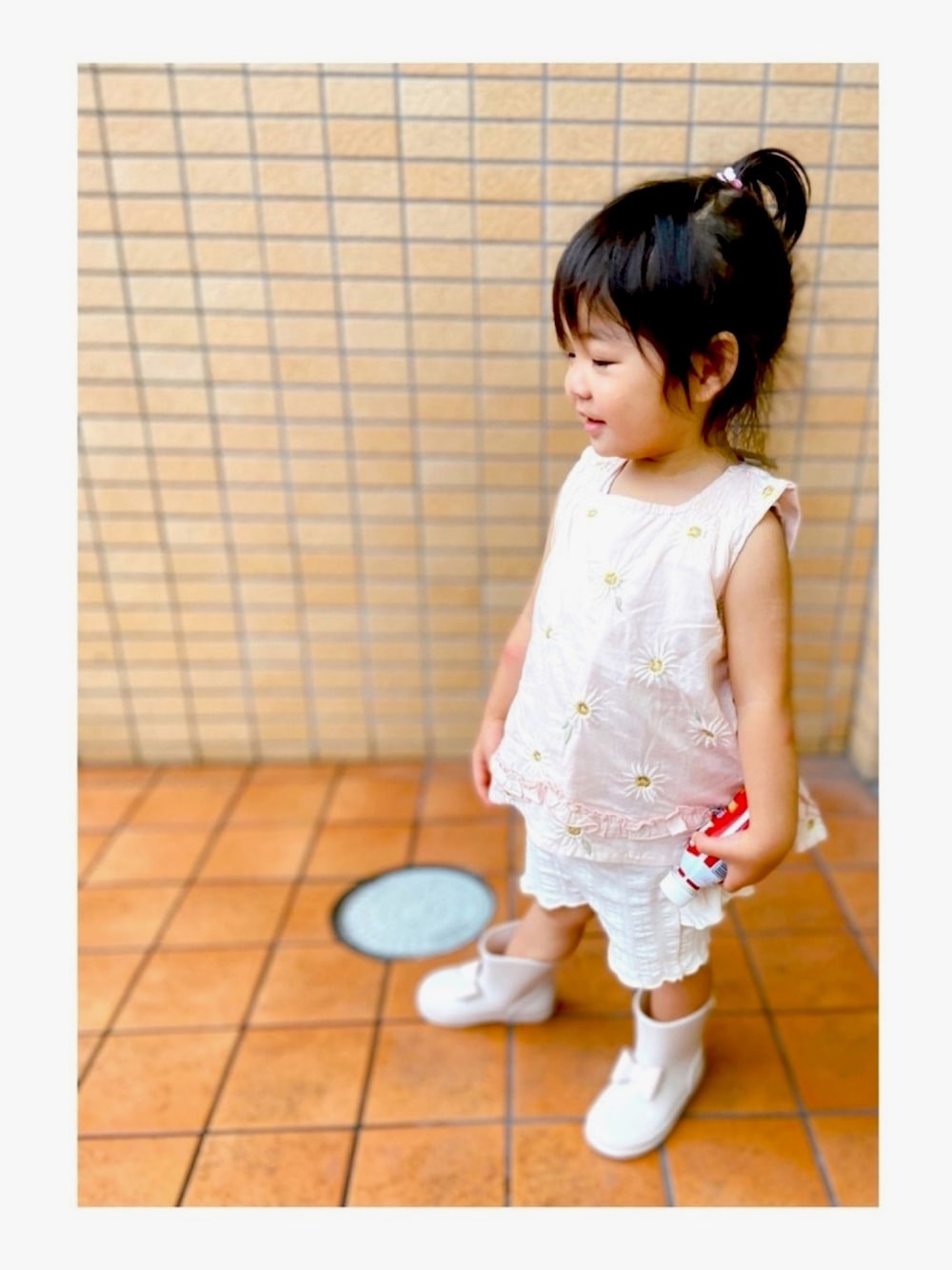 見てくださりありがとうございます(๑・̑◡・̑๑) いいね👍、お気に入りに登録➕ フォルダ仲間入りうれしいです(๑˃̵ᴗ˂̵)✨ 娘コーデ(๑>◡<๑) なーーーんも考えず💦 雨の日のムスメ。 髪もボッサボサです🤭 手には大好きなR-1を😘