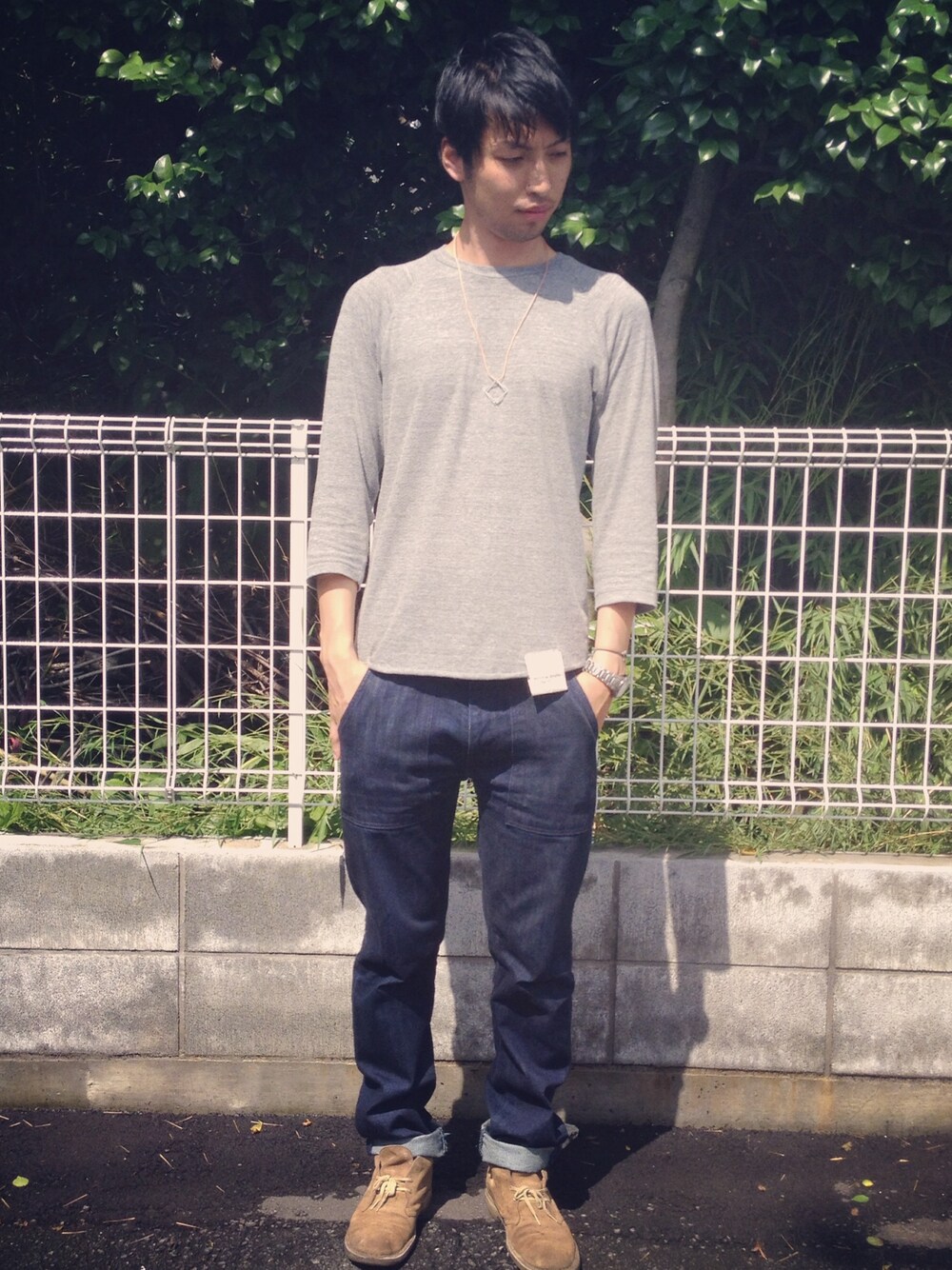 ゆったりした【UNDER NORTH】アンダーノースのTシャツは柔らかくてデイリーに着れる。 【Levi's】リーバイスのペインターパンツにお気に入りの【Clarks】クラークスのデザートブーツ!自分で作ったスクエアモチーフのネックもマストアイテムになるはず。