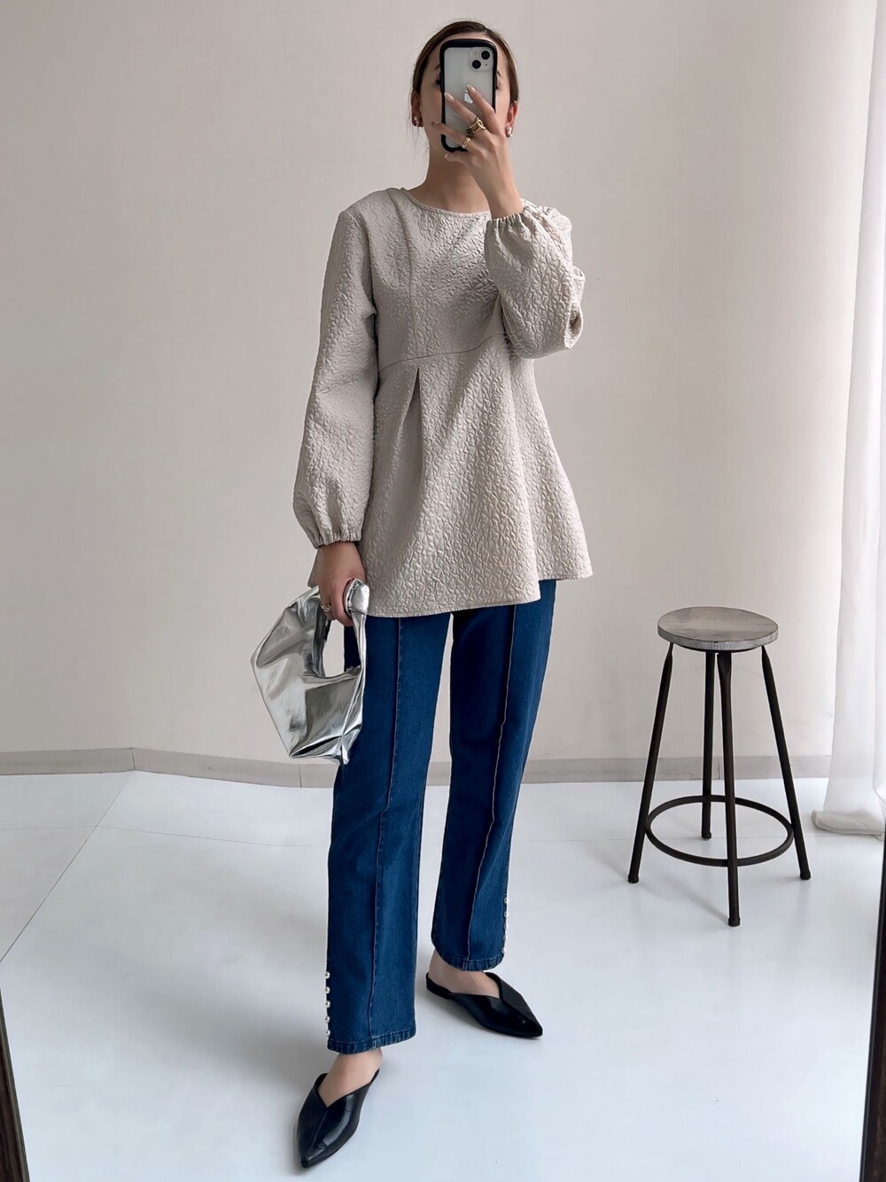 tops:ぺプラムの形が可愛いトップスです🤍ジャガード柄が高見え効果抜群👀💓 春っぽさを取り入れられるアイテム👚 pants:裾スリットにパールが付いているおしゃれなデニム🥺センターラインで立体的に見えるし、脚長効果◉👏