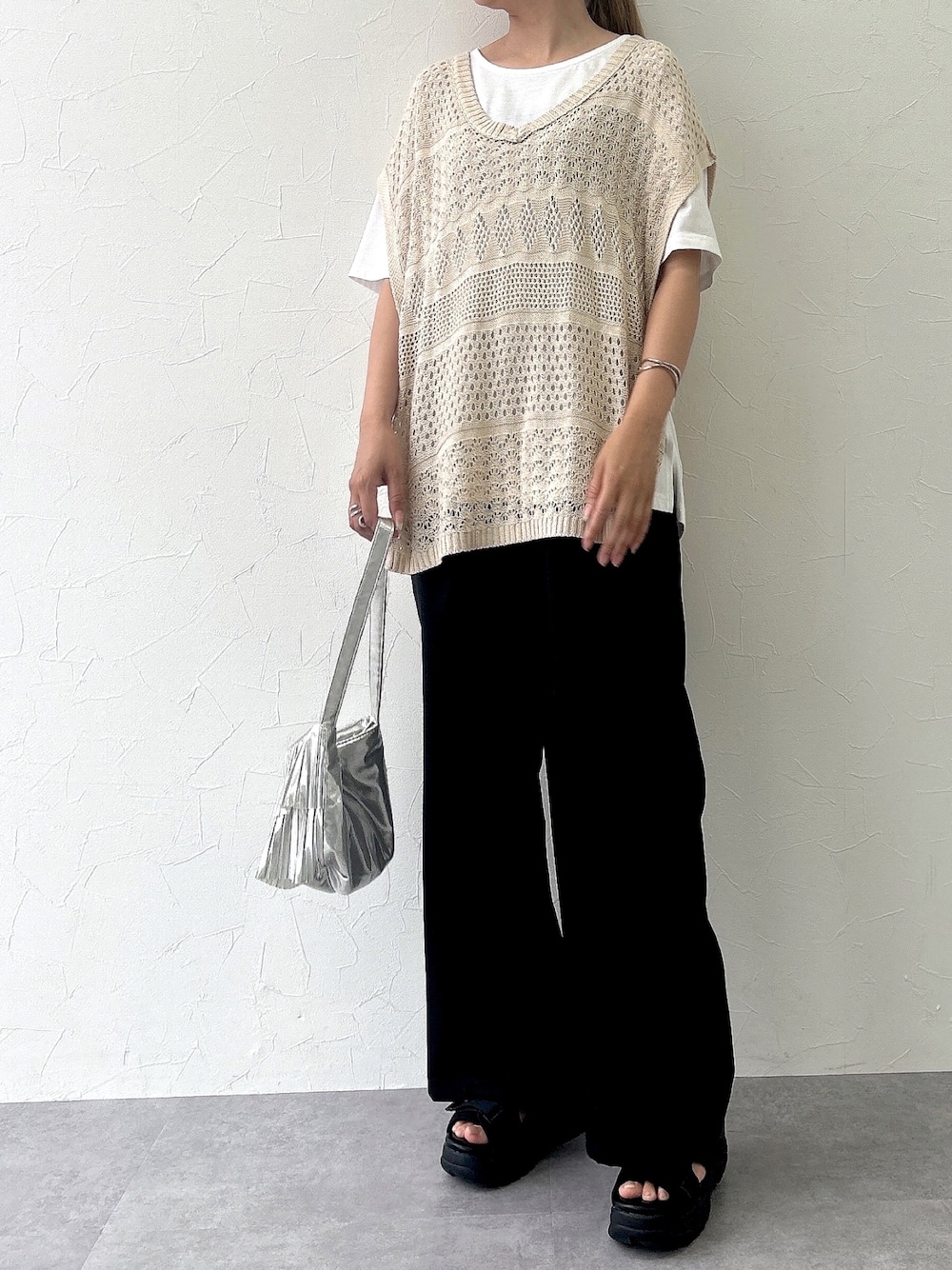 2点セットの透かし編みベストはたくさん着回しできる万能アイテム🥰 麻調のワイドパンツで夏らしいサラッとした履き心地🤪💓