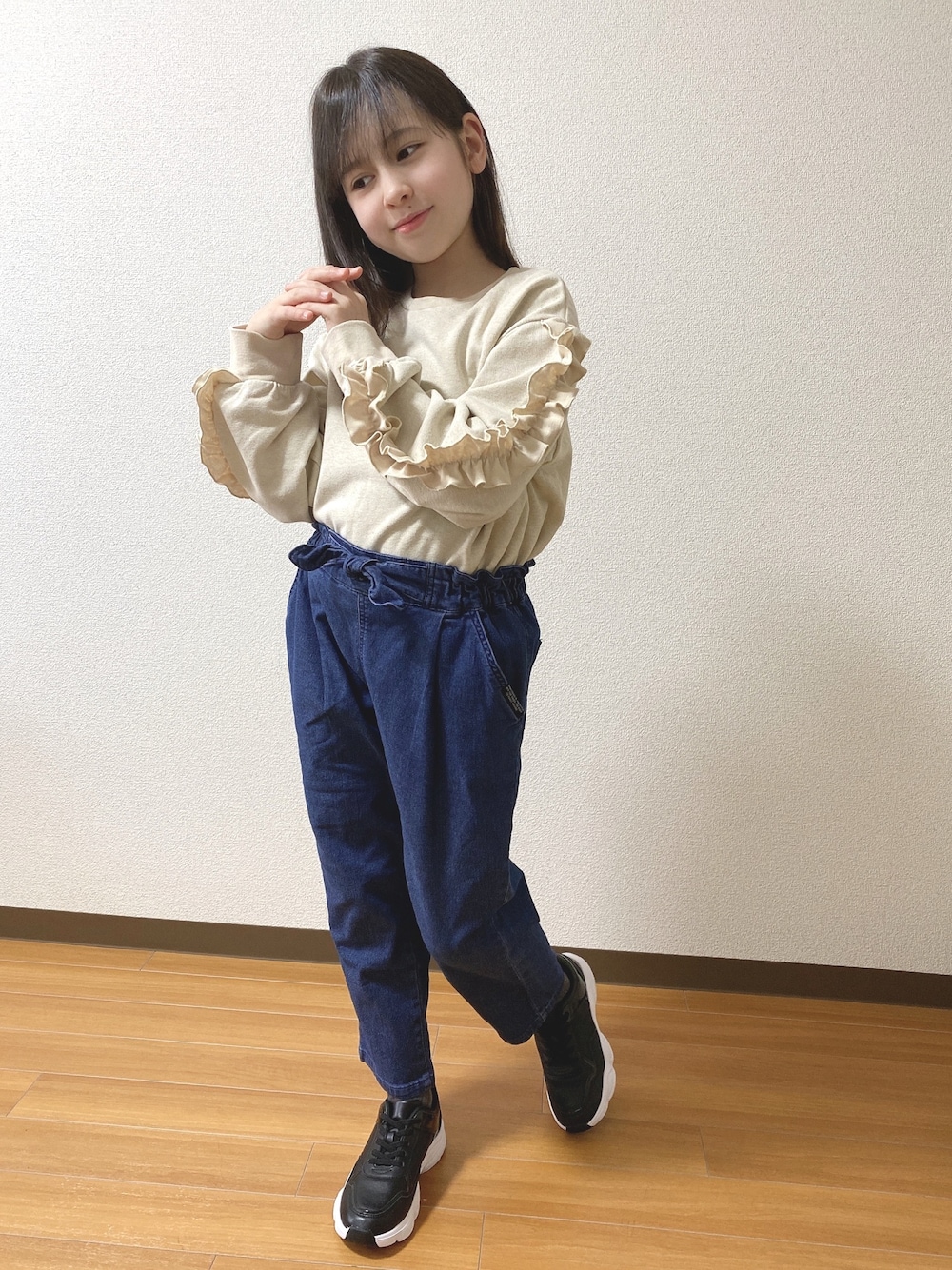 デニム×白系トップス 裏起毛デニムテーパードボトムスが 冬にほしいことがいっぱい詰まっていて 欲しすぎて買ったら期待以上の可愛さ✨ フリルスウェットもすごく可愛い💕