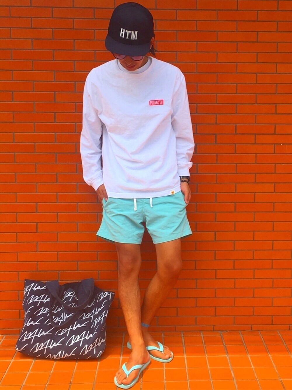 ゆるめのpizzanista!のロンTと H&Mのビーチショーツをタイトに履いたサーファー風コーデ