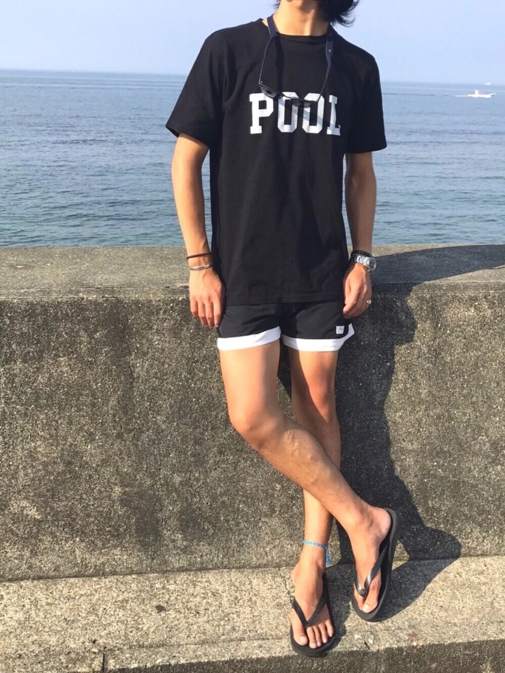 海のブラックコーデ サーフテイストなコーデに シティライクなプール青山のtシャツ 膝上ビーチショーツで足長効果