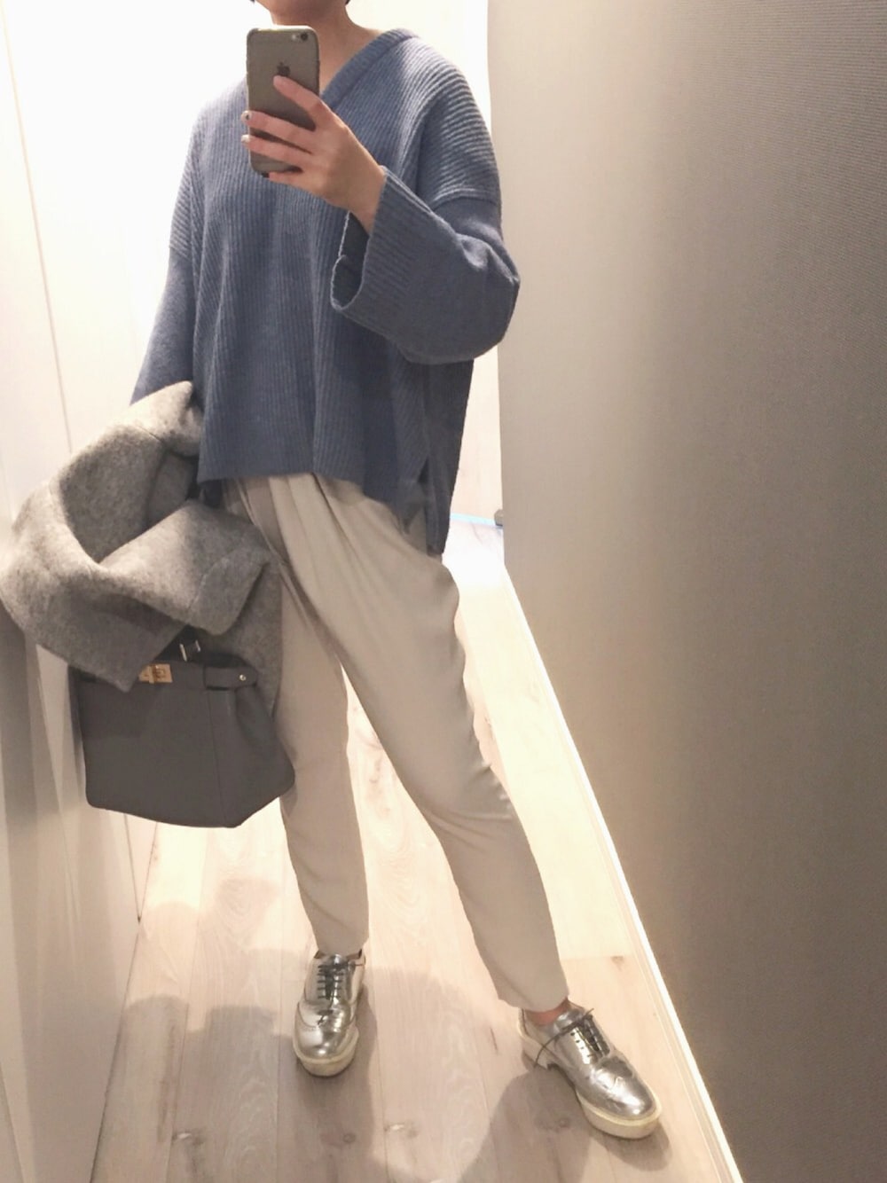 おはようございます😊 サックスブルー×ホワイト×グレーのグラデーションコーデ🎀 朝から細々と用事を足す今日は動きやすいパンツと靴で。 このアダムエロペのニットはシルエットが可愛いくてカーキと2色買いしました♡プロフィール写真でカーキの方着てます😅 セールでの戦利品👍