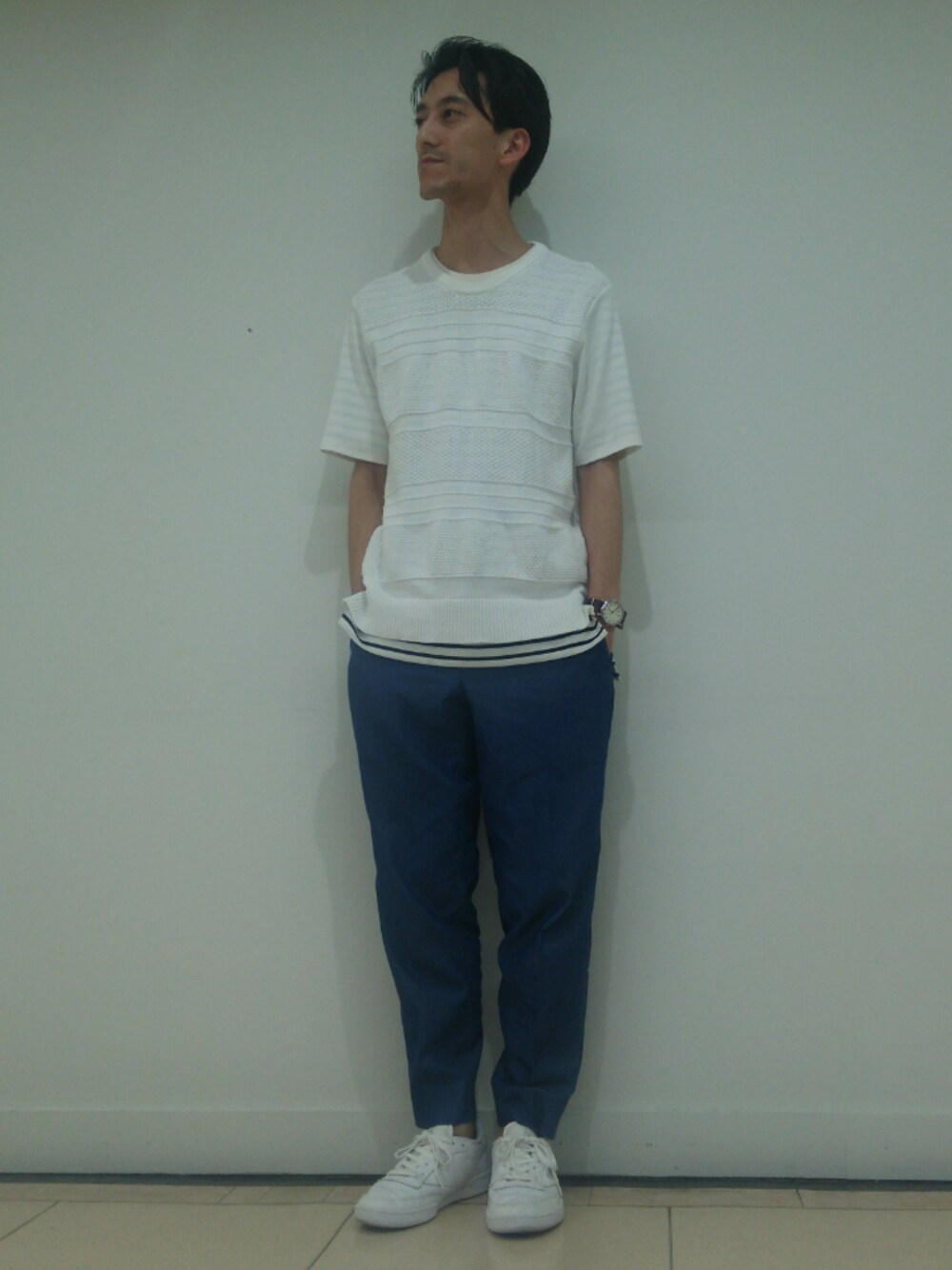 白のニットポンチをデニムでシンプルに合わせました。 インナーのボーダーもポイントです。