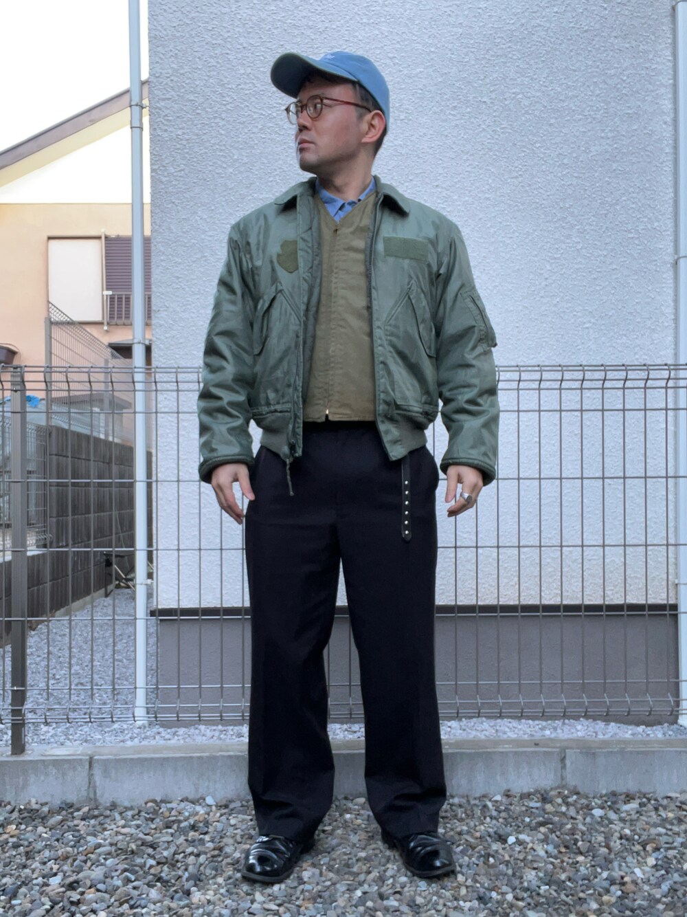 CWU-45PにUSnavyのシャンブレーシャツとN-1deckベスト、ロイヤルエアフォースのスラックス。