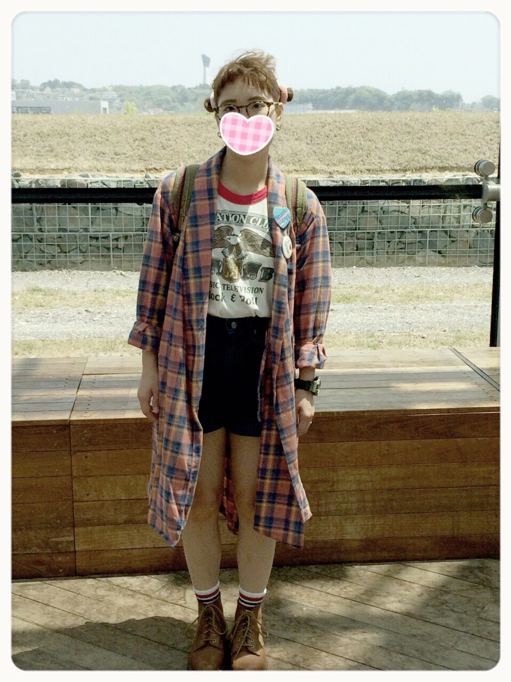 旅行2日目のコーディネートです(o'ω'o) 水族館行ったり海鮮食べたり♪ ガウン:avan lily Tシャツ:古着のMTVTシャツ ショートパンツ:古着 靴:Dr.Martens