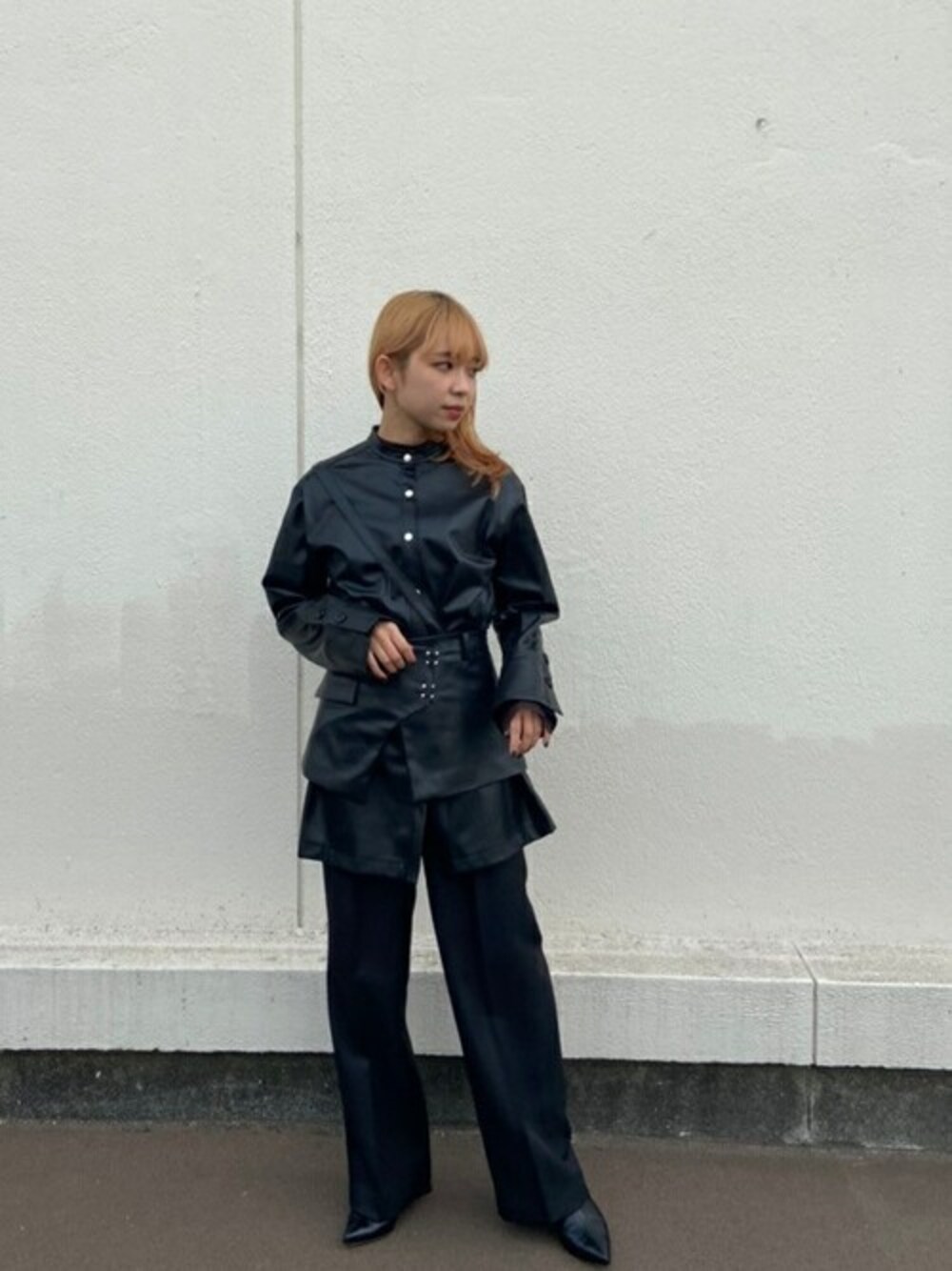 レザーはオールブラックでクールなコーデに。 ワントーンコーデでも周りとは違ったデザイン性でよりモードに魅せてくれます! 伸縮性のあるフェイクレザーなので着心地抜群です!