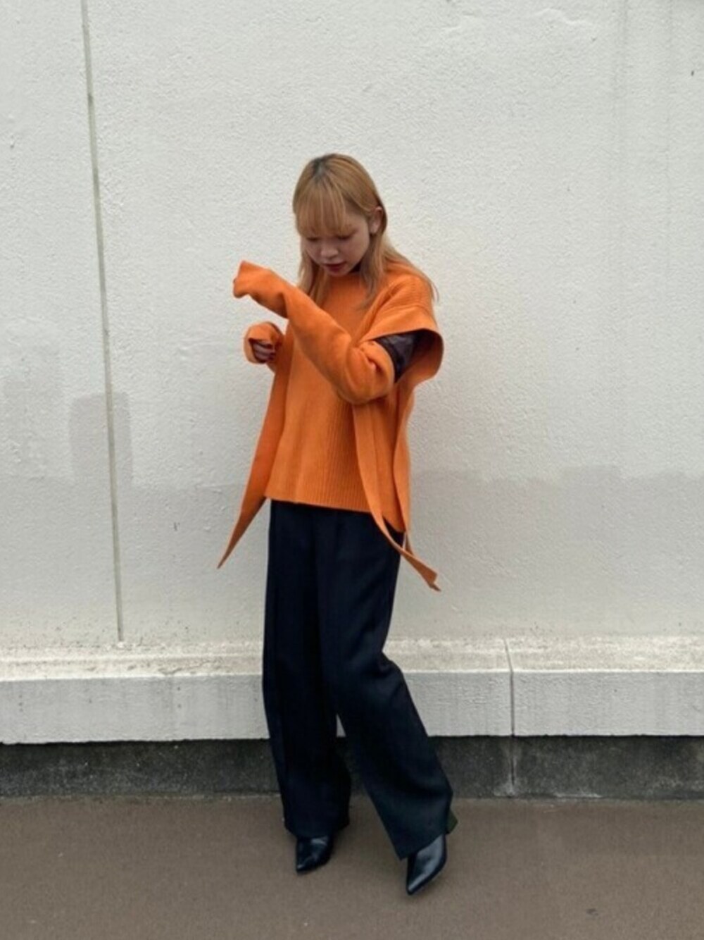 パキッとしたオレンジには黒が相性バッチリです! インナーにシアーカットソーを入れ、程よい肌見せをする事でよりお洒落に。 数少ないコレクションのアイテム、他の人と被りません!