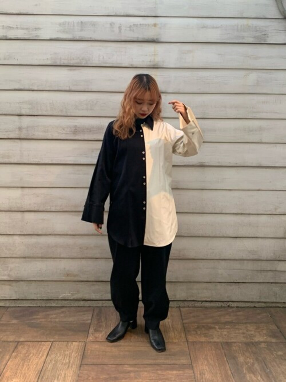 オーバーシルエットなモノトーンコーデです。 よく見ると左右で素材の違うシャツはコーデに締まりを与えてくれます。 更に白が入る事で重くなりすぎず、モードながらに春っぽさを演出できます!