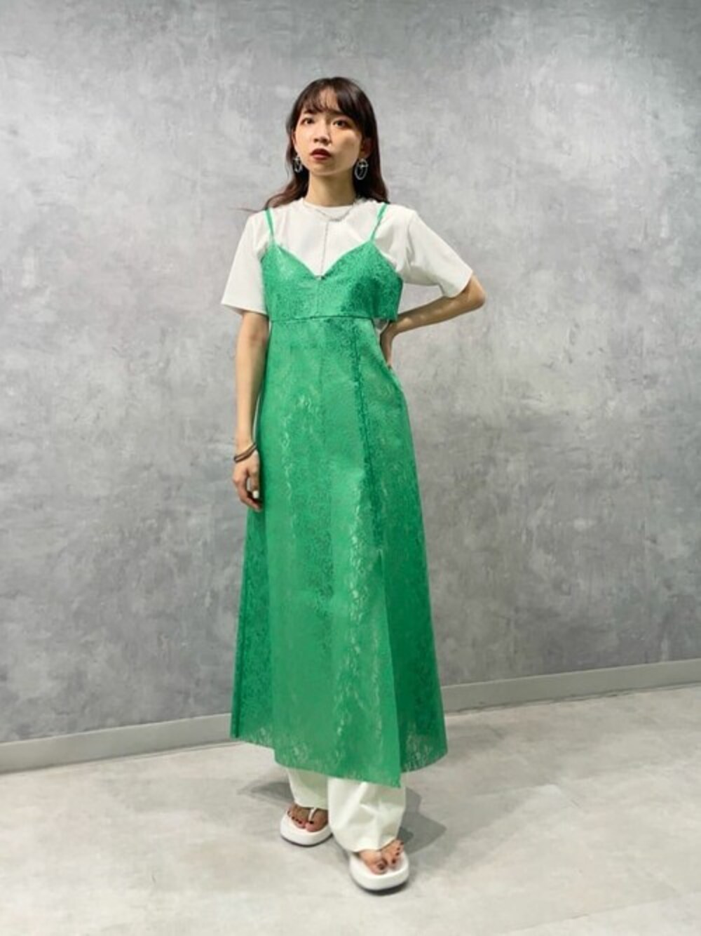 夏な色使いのコーディネートです! インナーは動きやすいジャージー素材でラミネートワンピースもかなり軽いので、涼しく着て頂けます! シンプルなアイテム使いにはUTの印象的なアクセサリーがぴったりです! TAGS: #休日スタイル #きれいめカジュアル #今日のコーデ #オトナ女子 #低身長 #夏コーデ #オトナカジュアル #パンツコーデ #低身長女子