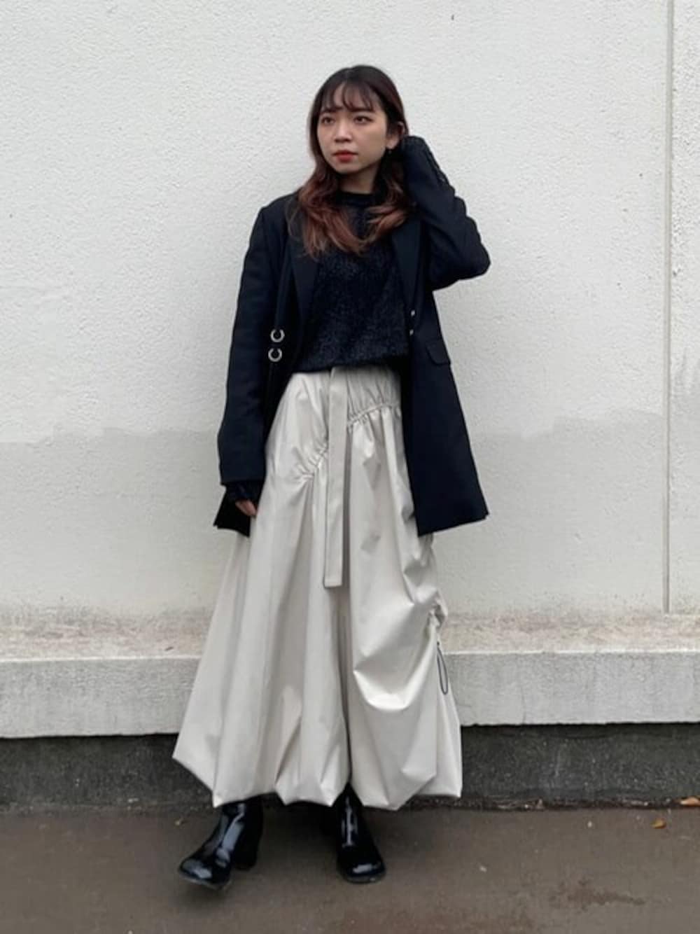 素材感で遊ぶモードコーデです! ニットも着込めるビックサイズジャケットとバルーン型のスカートを掛け合わせる事でバランスが取れます! どれも着心地が楽なのでオススメです!