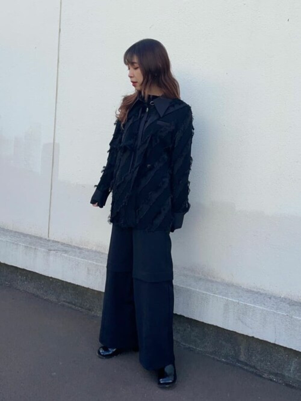 重くならないオールブラックコーデです! シャツはスケのあるシアー素材なので、下にニットを重ね着しています! 春先まで使える素材なので羽織としても活躍間違い無しです!