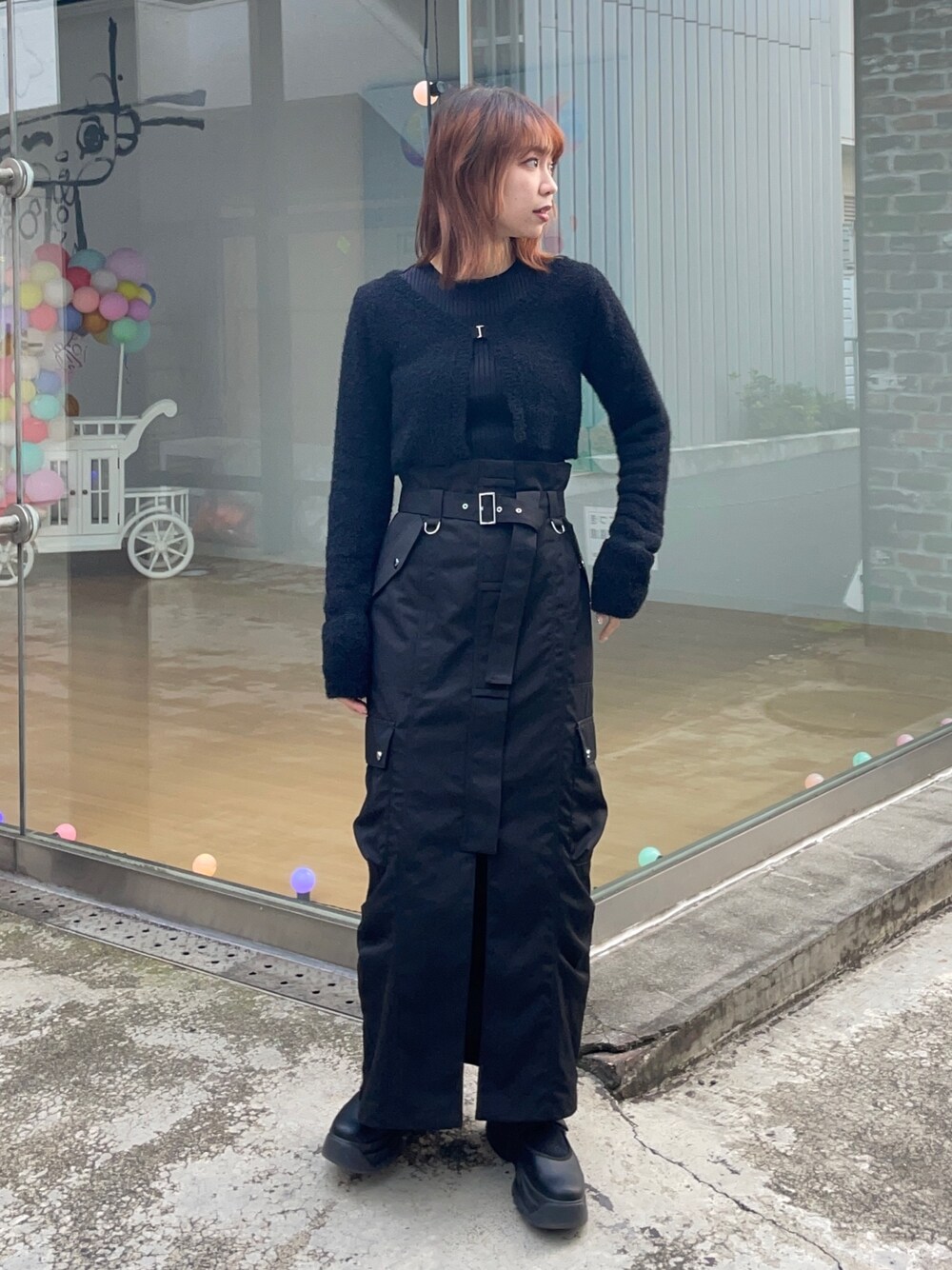 トレンディなブラックコーデです! トップスはカーデとインナーで別々にもお使い頂けます! スカートはカジュアルなデザインですか、かなり綺麗見えするので、いかつくなりすぎないのでチャレンジして頂きやすいです。