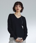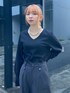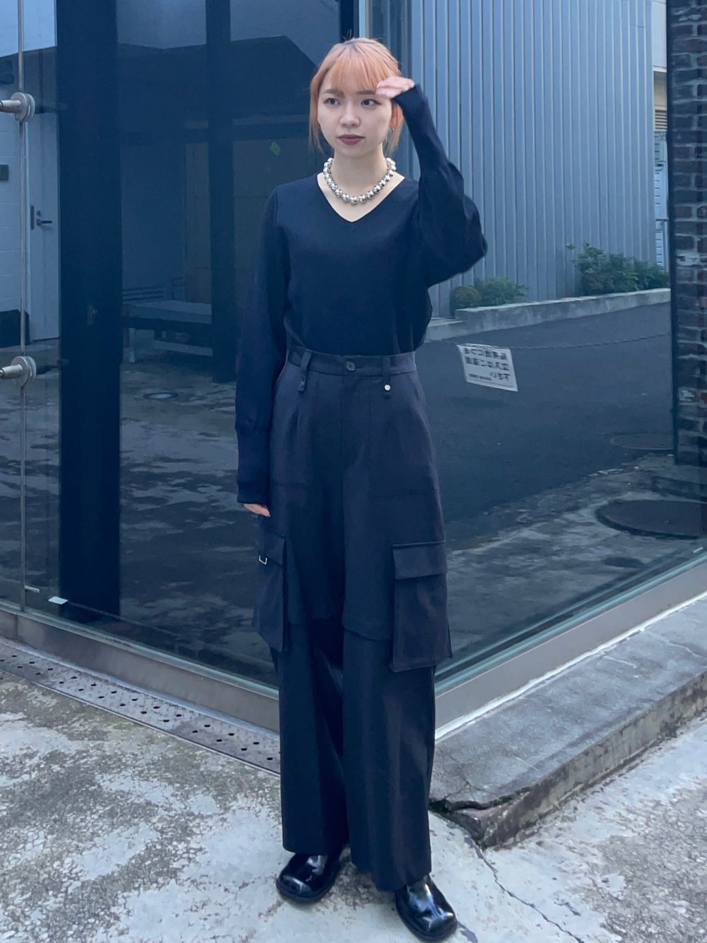 いかつくならないオールブラックコーデです! Vネック×カーゴパンツの相性抜群。 女性らしさ満点の大人カジュアルコーデ。