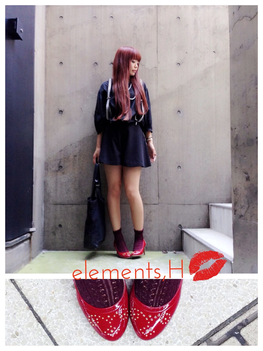 真っ黒コーデ×ちょこっと赤 ブラウス&パンツ&サスペンダー&バッグ/elements.H http://www.elementsh.jp シューズ/COCUE アクセサリー/Q-pot