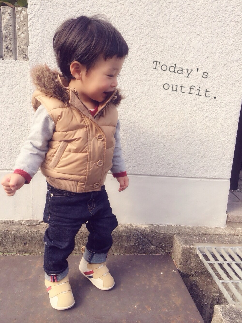 フードのファーが怖かったらしく 固まって横目で見ては 泣いていた僕ちゃんでした☻ ちなみにデニムは本来 スキニータイプですが まだまだ小さな僕は ダボダボです。 でも、それもいい感じ! パパと公園へ行ってらっしゃい!