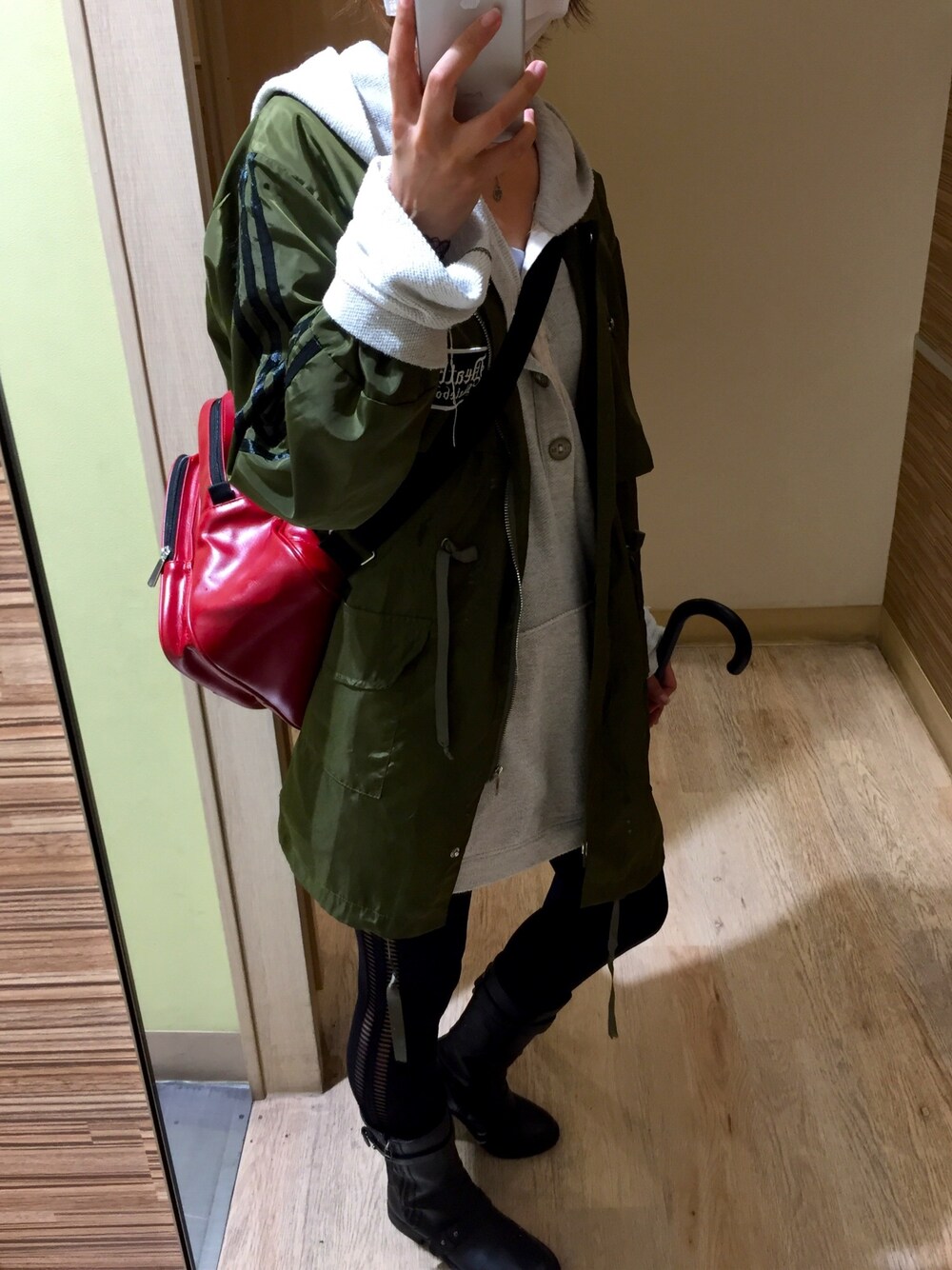 ミリタリージャケットを羽織ってレインコートのように活用しました。 男性用のフード付き長袖で、ビッグサイズでダボっと着るのがお気に入り。 サイドオープンレギンスはトップとブーツに合わせました🦕
