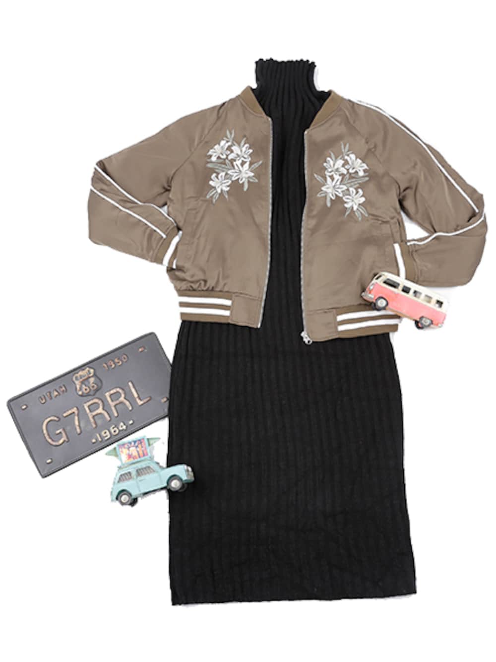 【カッコ可愛い欲張りコーディネート】 今季大注目のガーリーな刺繍がポイントのスカジャン。 生地は光沢感がありツルツルとした肌触りです。 袖のライン部分がロープ編みで施されているので立体感があり、腕を細く見せることが出来ます。 ボーイッシュなイメージがあるスカジャンですが、色味と刺繍が女性らしい印象を与えてくれるのでチャレンジしやすいアイテムです。 Iライン(細見え)効果があるワンピース。 温かみのある色展開で、これからの時期にピッタリです。 袖はゆったりとしていて、下に重ね着をしても動きやすいです。 また、羽織りや小物を用いたりすると違った雰囲気を楽しめそうです。 シンプルなのでシーンを選ばずに着ることができ、1枚あるだけで様々なコーディネートが出来るのでオススメです。 ellerie(エルリエ)公式通販 http://www.ellerie.jp/