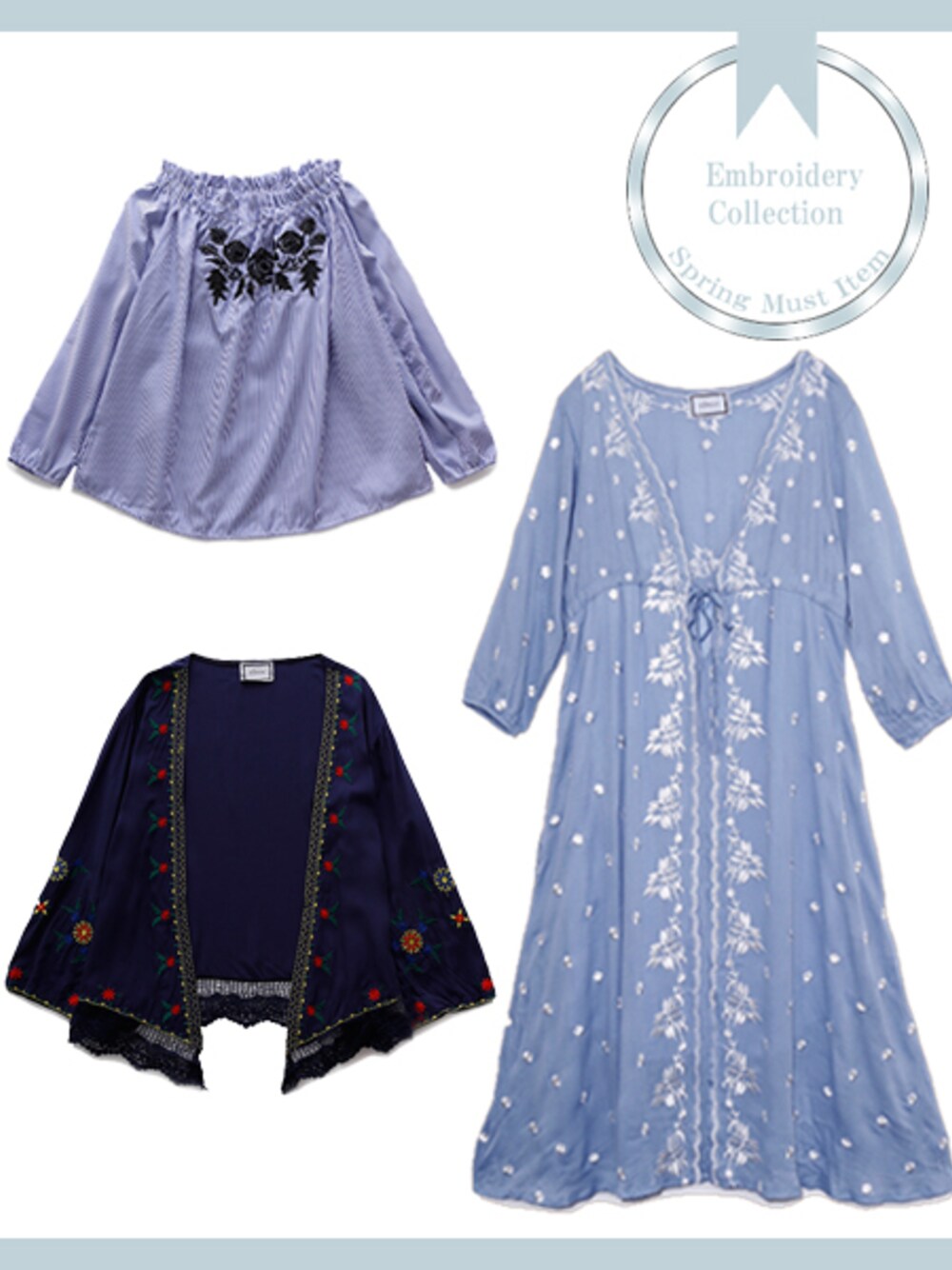 【】 爽やかな色味の生地にバラの刺繍が魅力的なブラウス。 胸元の他にも腕にも刺繍が施されており、女性らしいさが演出してくれます。 コンとライトブルーは刺繍の色が違います。 ゆるっと着られる体にフィットしないシルエットは、体型を気にせず着ることができるのでオススメです。 また、丸みのあるボリューム袖がポイントです。 その日の気分やシーンによって、普通のスタイルや肩出しスタイルができコーディネートを楽しめるアイテムです。 カラフルな刺繍が散りばめられているのがポイントの羽織り物。 裾のレース部分は約9cmです。 これ1枚で全体のコーディネートの印象をガラッと変えることができるのです持っておくと楽しめそうなアイテムです。 春に欠かせない刺繍アイテムのワンピース。 V字ネックとロング丈で白の刺繍が女性らしい雰囲気を演出します。 高い位置でウエストが絞れるのでスタイルが良く見え、動く度にユラユラと揺れる裾がポイントです。 これ1枚でオシャレに着ることができ、オススメなアイテムです。 ellerie(エルリエ)公式通販サイト http://www.ellerie.jp/ 春物続々入荷しています♡ 毎日新作アイテムが30%OFFになるタイムセール実施中です。