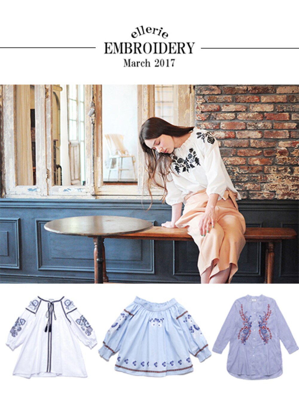 【たくさんの刺繍に囲まれて・・・♡】 爽やかな色味の生地にバラの刺繍が魅力的なブラウス。 胸元の他にも腕にも刺繍が施されており、女性らしいさが演出してくれます。 コンとライトブルーは刺繍の色が違います。 ゆるっと着られる体にフィットしないシルエットは、体型を気にせず着ることができるのでオススメです。 また、丸みのあるボリューム袖がポイントです。 その日の気分やシーンによって、普通のスタイルや肩出しスタイルができコーディネートを楽しめるアイテムです。 色鮮やかな刺繍が目を惹くブラウス。 丸みのある袖をキュッと絞った手首がポイントです。 胸元のリボンは約67cmの長さがあり、タッセルが付いているのが全体を引き締めてくれます。 Aラインの形ですが、刺繍風のワッペンラインが首元や肩、フロント部分にデザインされているのでスッキリと見せてくれます。 丸みのある袖をキュッと絞った手首とゆるっとしたシルエットがマッチしているブラウス。 黒とオレンジのラインが刺繍になっていて、全体を引き締めてアクセントになっているのもポイントです。 オフショル部分と袖部分の構造が別々に作られているので、腕を上げても上がってくることはないです。 コーディネートに合わせて、肩を出さずにトップスとしてきたり肩を落としてオフショオルにもなるのでガラッと雰囲気を変えられるアイテムです。 モカチャとブルーの刺繍模様がポイントのスキッパーシャツ。 ストライプシャツはきちんと感のイメージですが、抜け首デザインでうなじが見えるように着崩すとこなれ感が出て魅力的になります。 裾が丸くデザインされていて前後の丈の差があるので柔らかい印象になります。 またシャツとしても羽織りとしても使える丈感なので、その日の気分やコーディネートに合わせて着方を変えてみても楽しめるアイテムです。 ellerie(エルリエ)公式通販 http://www.ellerie.jp/ 春物続々入荷しています♡ 毎日新作アイテムが30%OFFになるタイムセール実施中です。