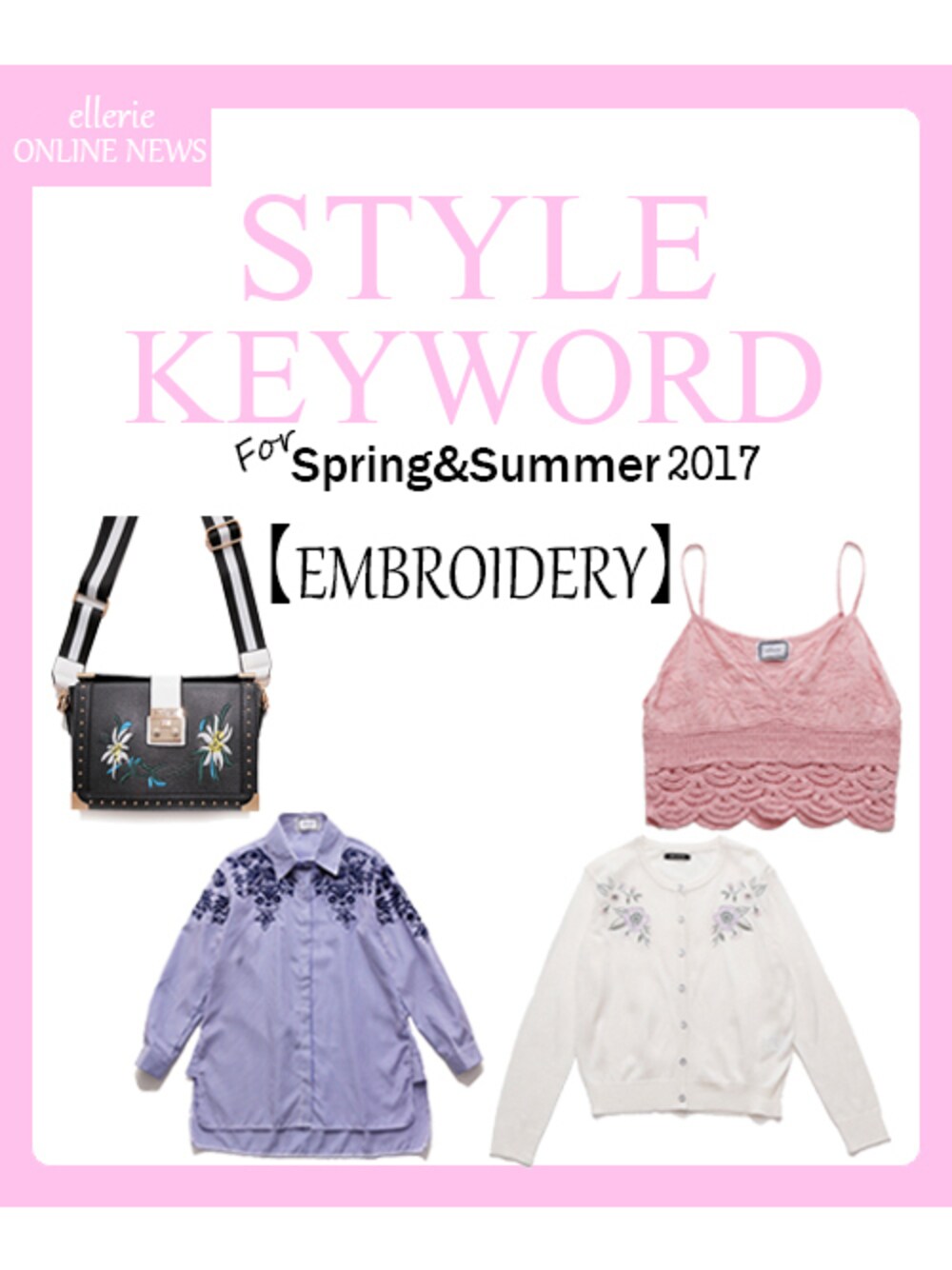 【今季注目ファッションキーワード:刺繍】 刺繍アイテムは今季大流行していますよね~♡ 今年はどんなアイテムでも刺繍がデザインされているものが多く、さりげなく取り入れることが出来るのでオススメです。 ellerie(エルリエ)公式通販 http://www.ellerie.jp/ 春物続々入荷しています♡ 新作アイテムが30%OFFになるタイムセール実施中です。