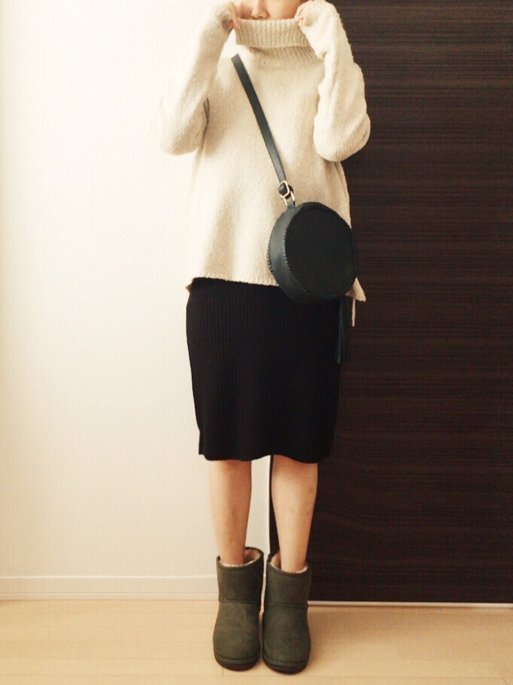 まよのスカート「[ウール混]リブ編みニットスカート/膝丈スカート」を使ったコーディネート