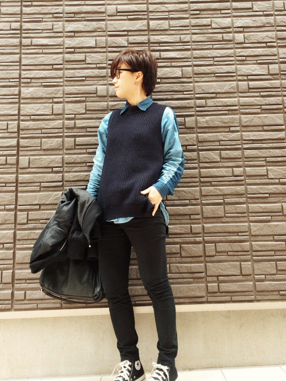 着用コーデ:4件シャツにベストの時季が来ましたな❤️ 襟高めのベストがお気に入りです😍❤️ 手が、微妙な感じにw
