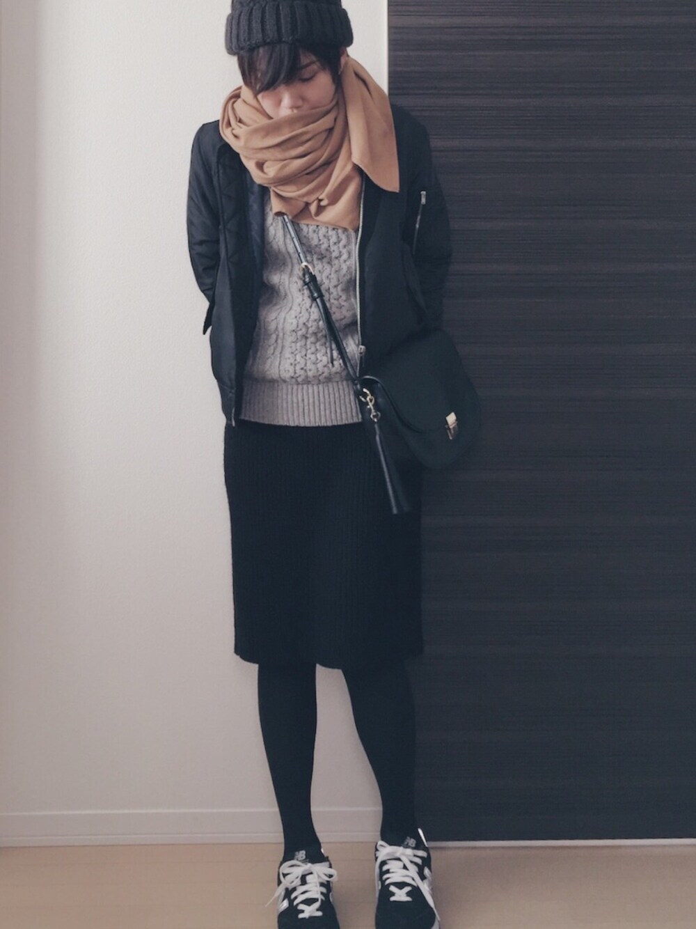 まよのスカート「[ウール混]リブ編みニットスカート/膝丈スカート」を使ったコーディネート
