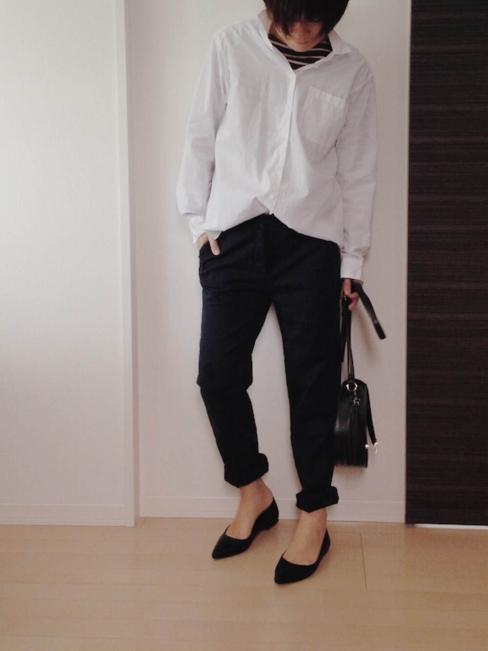 ブルー系のチノパンツ、ホワイト系のシャツ/ブラウスを着用したレディースの冬コーディネートの1枚目の写真