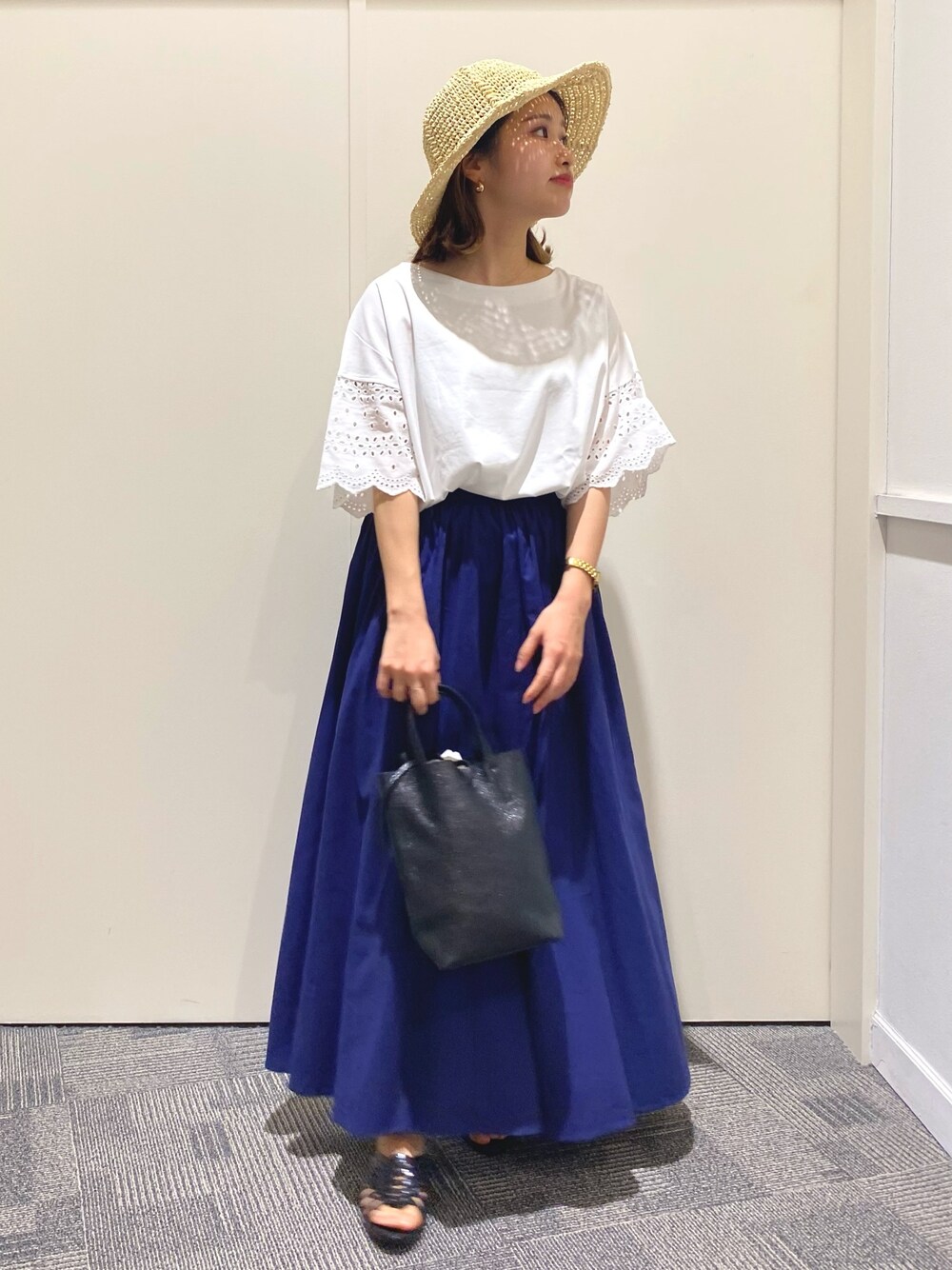 夏のエレガントスタイルです。 ハットのあみあみが影でレースっぽくなって アクセントに! いつものコーディネートにプラスするだけで 少しエレガントな雰囲気になりますよ^_^ レーススリーブのトップスで偶然統一感がでました◎ リバーシブルのスカートは鮮やかなブルーの方を履いてみました。 ウエストが総ゴムなのですごくラクですよ^_