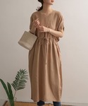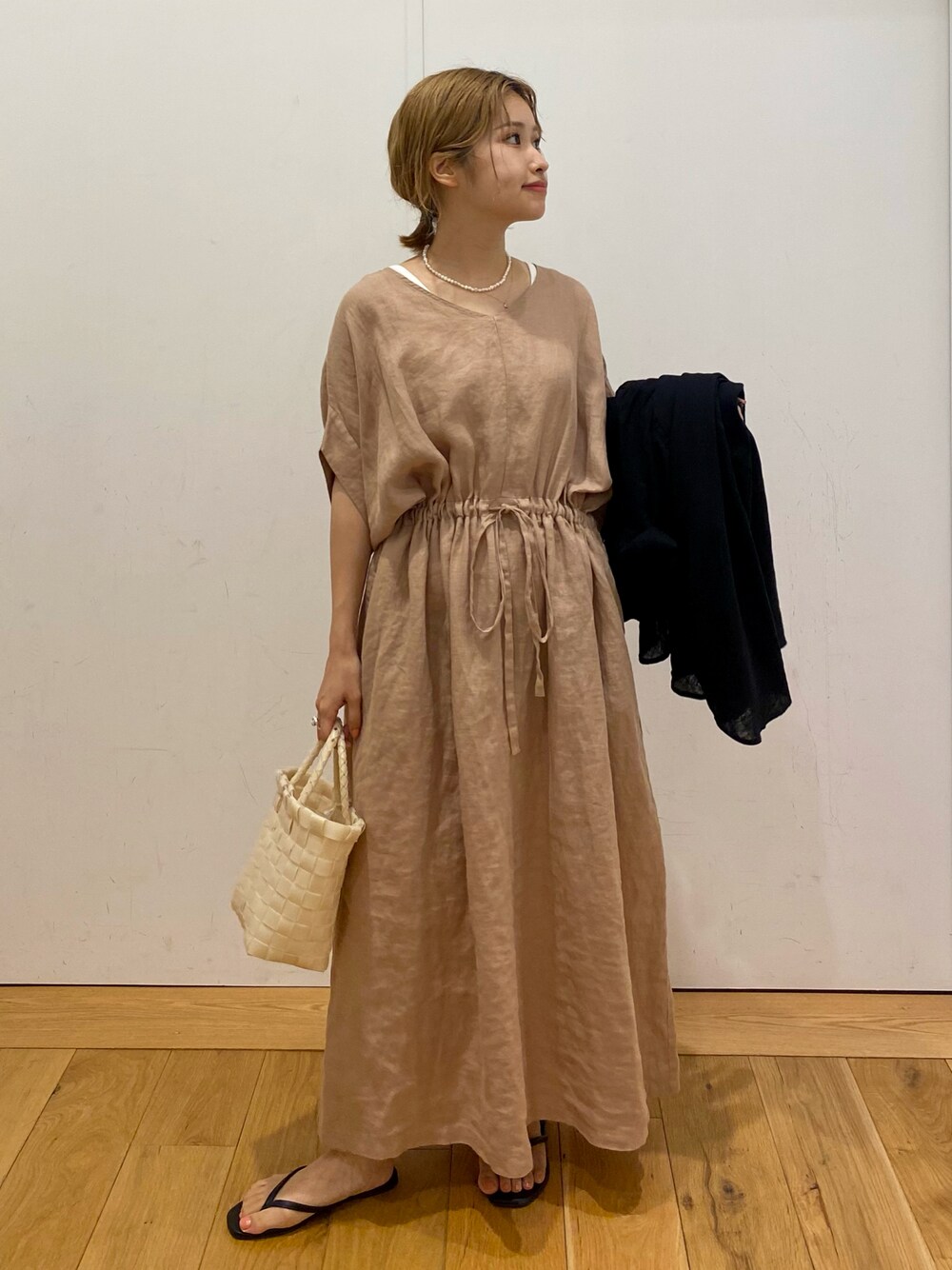 リネンのワンピースはサラッと一枚で季節感出て可愛いですね〜◎ ウエストまわりにデザインがあることでバランス良くみえるので小柄な方にもおすすめ。 ウエストをギュッと絞ってもゆるっと絞っても可愛いです!