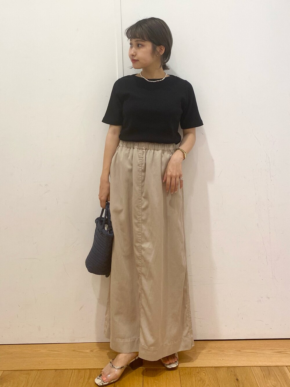 きれいめカジュアルコーデです。 リブで少しタイトめなトップスで女性らしさを出し、カジュアルなスカートを合わせてもカジュアルダウンしすぎないようにバランスを取りました!