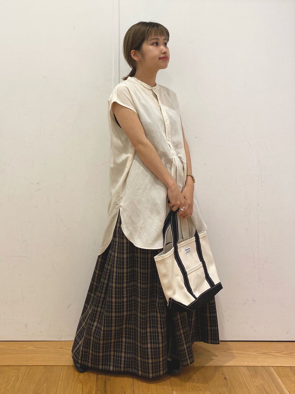大人カジュアルスタイル。 まだ気温は高いけど秋カラーを取り入れたい時はチェックスカートを😆🍃 ボリューム感が可愛くてコーデの主役になります。