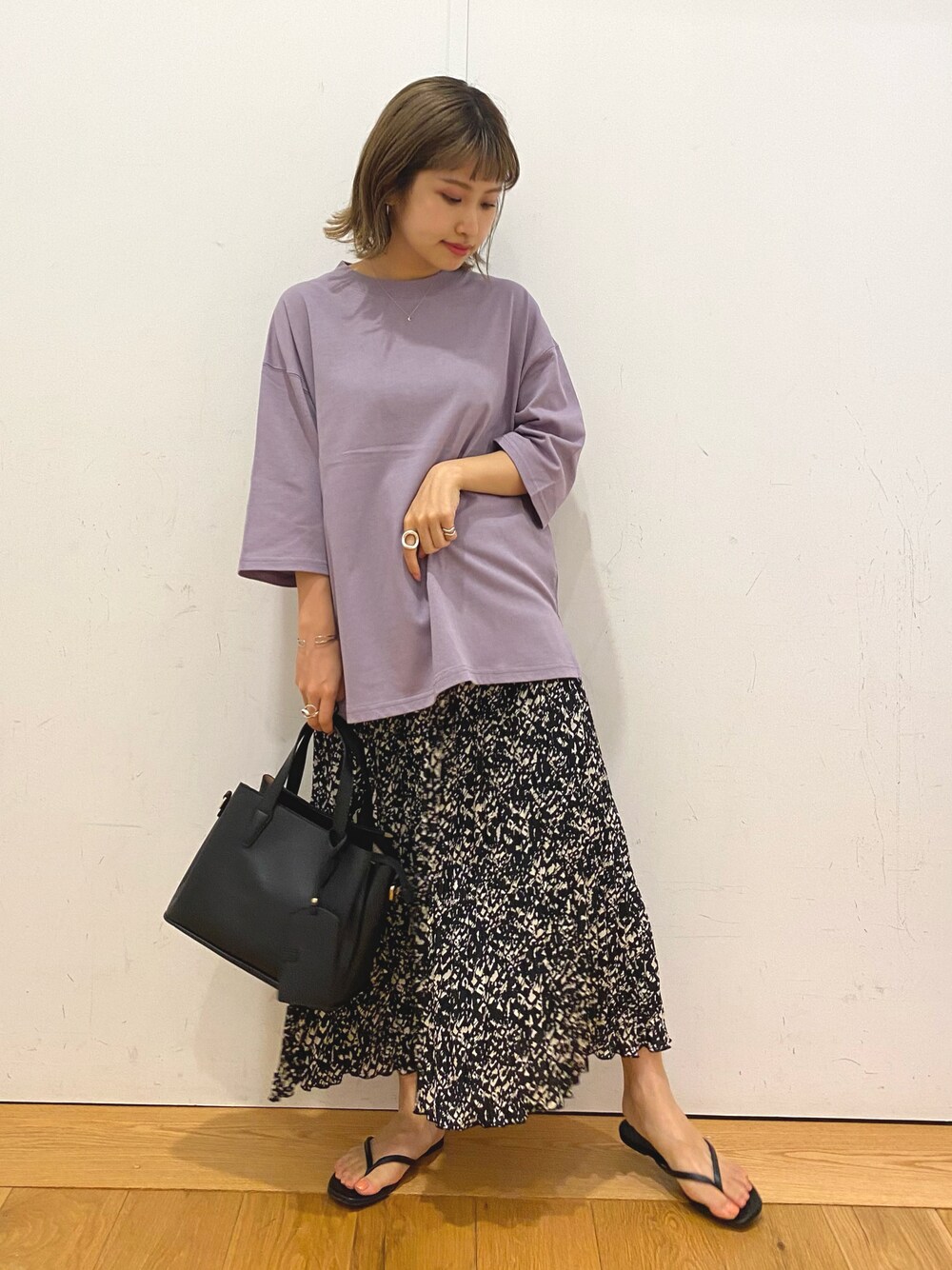 ラフコーデです! Tシャツにきれいめなランダムプリーツスカートを合わせて、ラフだけどどこか上品見えもするコーディネートです。