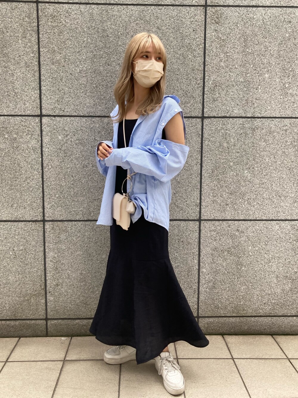 ワンピース/ブラック/free 夏素材の軽い着心地です!! フレア型なので、スタイルアップ効果抜群です! スリットが入ってるので、今年っぽく着て頂けます。 シャツ/ブルーストライプ/フリー ボタンを取ると肌見せができるので、 色んな印象が楽しめます!!