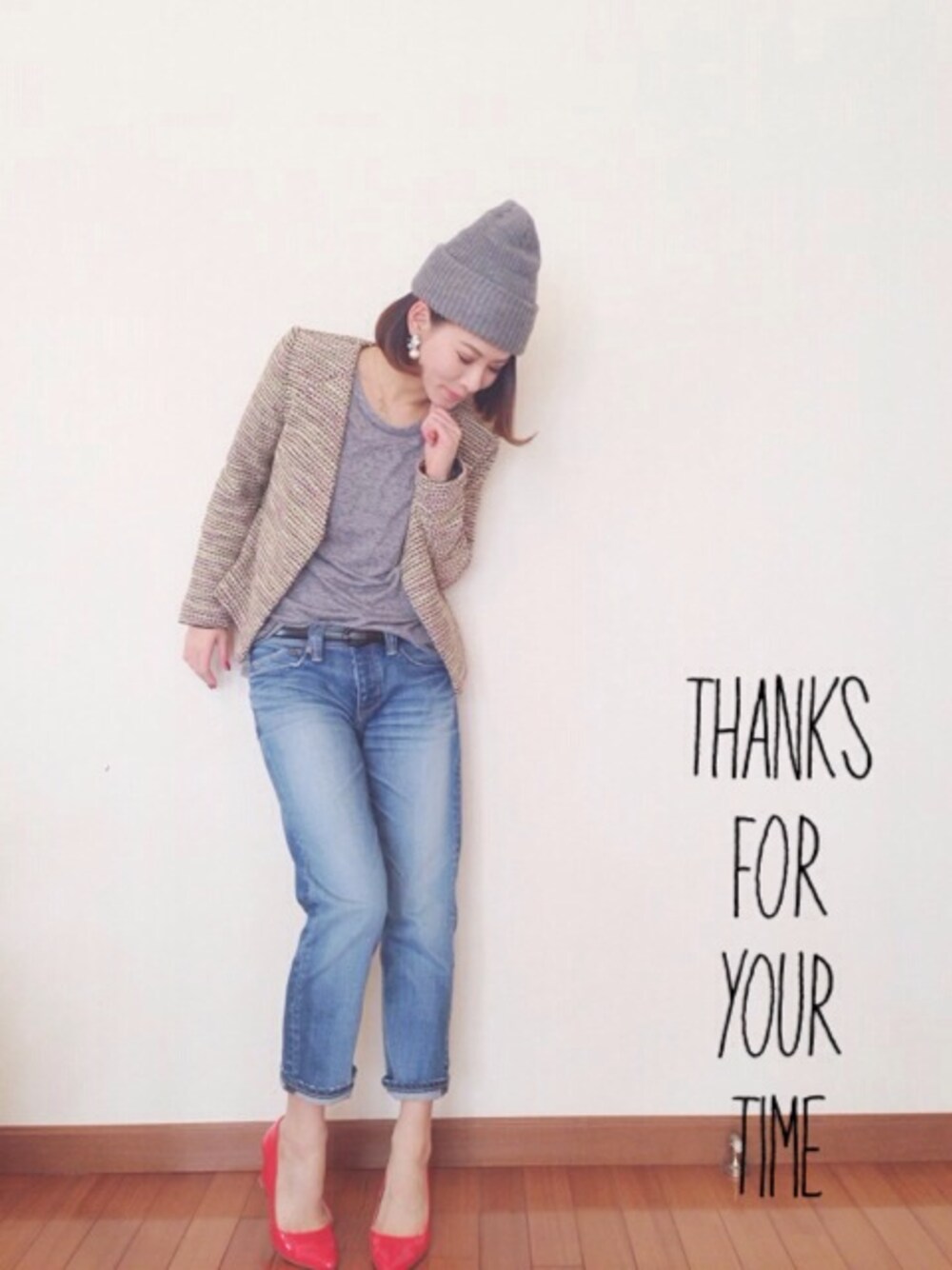 emaemiのテーラードジャケット「BOUCLE COLLARLESS JACKET」を使ったコーディネート