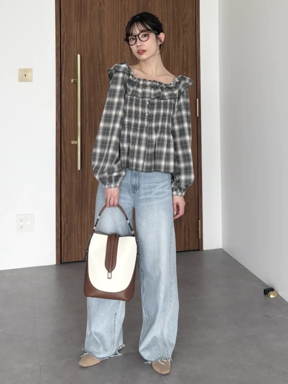 earth music&ecology official(earth music&ecology)のシャツ/ブラウス「【2026SS】チェックシャーリングブラウス」を使ったコーディネート