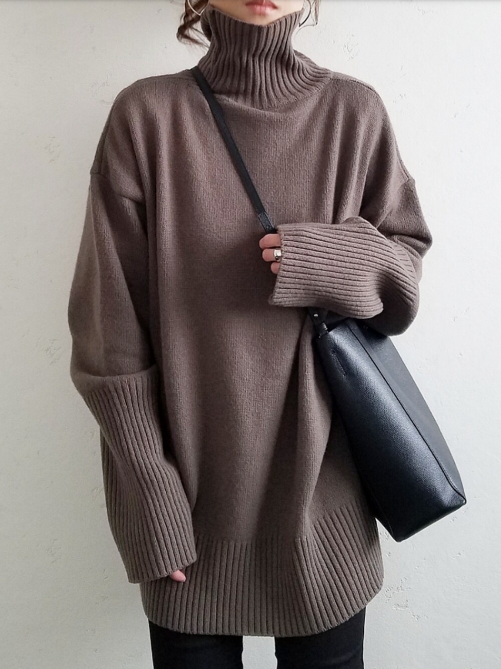 ブラウン系のニット/セーター、ブラック系のショルダーバッグを着用したレディースの秋コーディネートの1枚目の写真