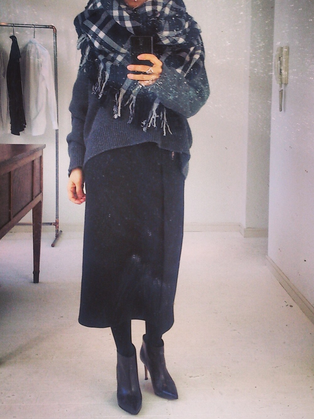 デニスのストールがとにかく暖かく、毎日巻いてます。 手織りのカシミアで驚くほど滑らか。 ストール、ニット、ブーツは今季購入のものですが、スカートは10年前くらいに買ったプラダのです(笑)