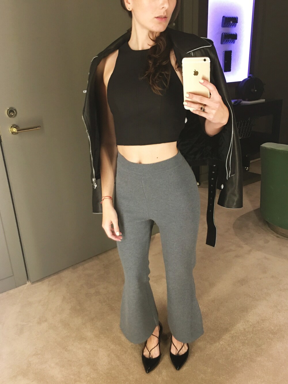 I'm a huge fan of these #StellaMcCartney flares! 😎 --- Shop The Look @ #TheWebster #AlexanderWang crop #Celine leather jacket #StellaMcCartney pants #Aquazzura flats DM for more details & photos! Shipping within US