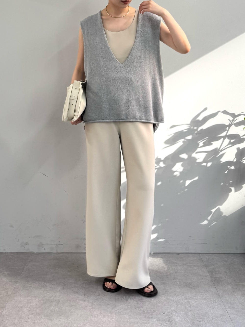 昨年人気だった深Vニット ニュアンスカラーでまとめて、 インナーには艶のある素材を合わせて メリハリをつけました。