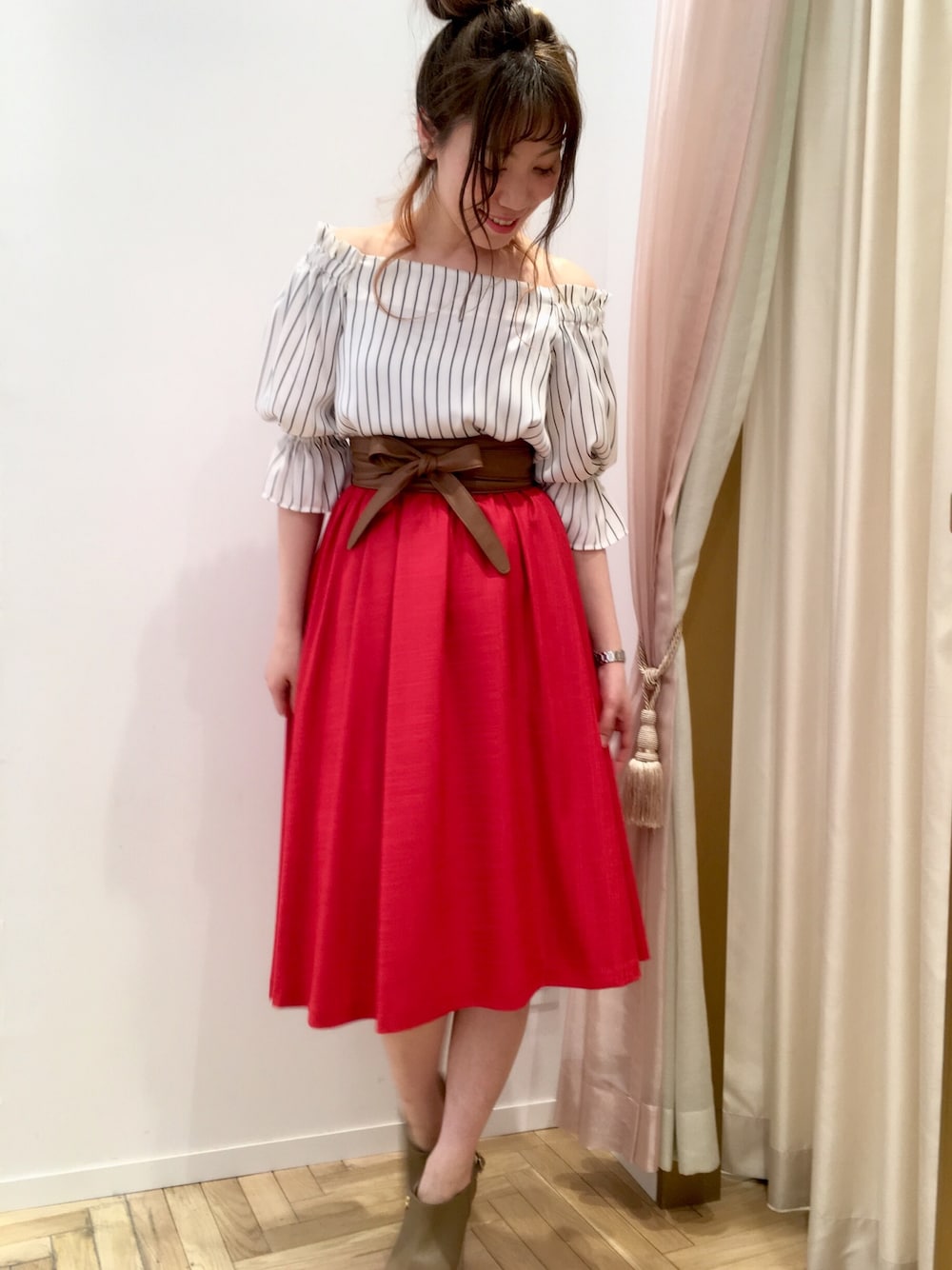 ここ最近、ずっと気になっていた赤スカート✨をついに買いました♪ オフショルで着るとブラウスの袖に更にボリュームが出て可愛い。 色々着回せそうで楽しみです♪
