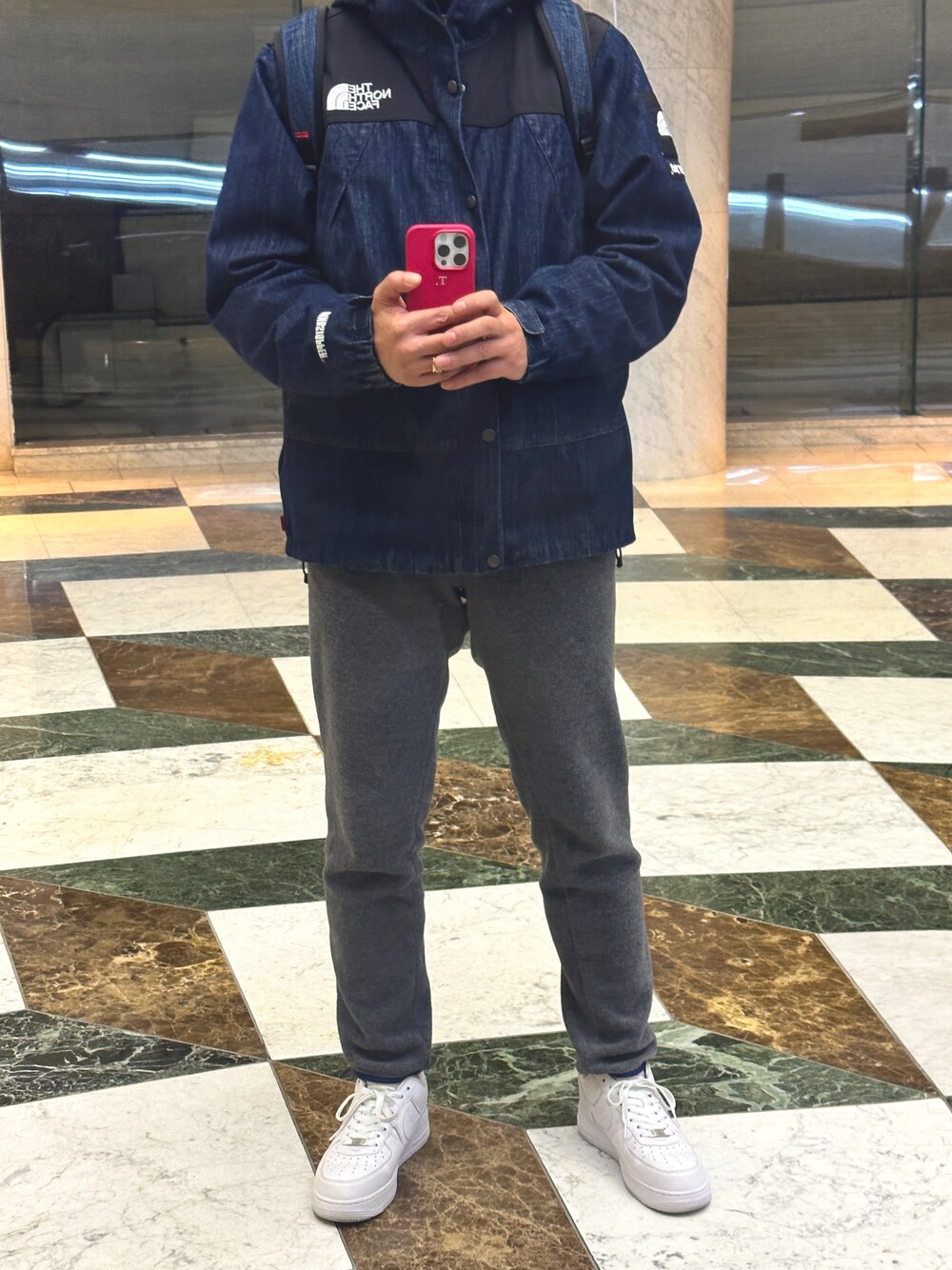 少し前の写真です。 Supreme×North faceのデニムドットショットジャケットにNorth Faceのフリースパンツ。足元はエアフォース1とSupremeのコラボで。