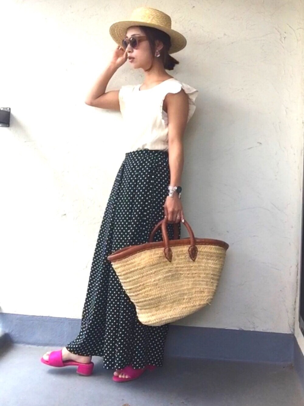 ドットのワイドパンツとピンクのサンダルが相性ぴったり🙌💓💓 夏の避暑地にこういうコーデして出掛けたいなぁ👒🌿🌻