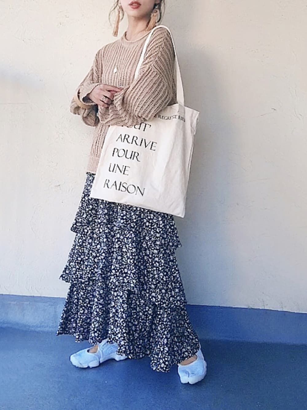 シアーニットに @lilychic_online の小花柄ティアードスカート♡ 歩くたびにお上品に揺れるティアードスカート♡ オチ感があって、アラフォーでも着れる綺麗なシルエットの大人可愛いスカート💋 スニーカーと合わせてカジュアルダウン👟
