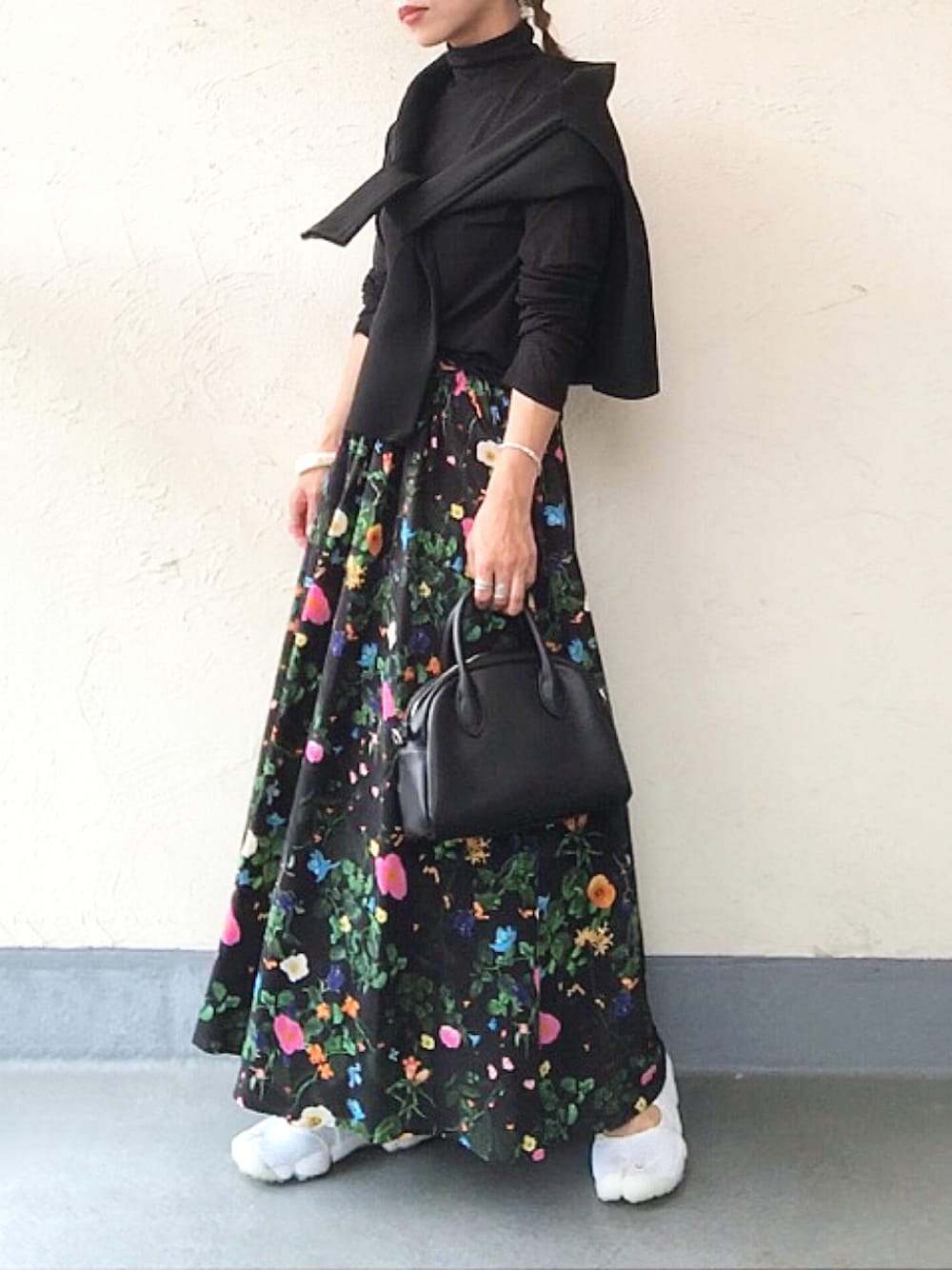 ブラックに発色の良いボタニカルフラワーが鮮やかに映えるロングスカートは @noisemaker_jpn の🌺🌹🌼 程よい落ち感があって、大人女子にぴったりのフラワースカート💋 歩く度に綺麗なボタニカルフラワーが揺れて、気分も明るくしてくれる💐♡♡♡