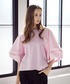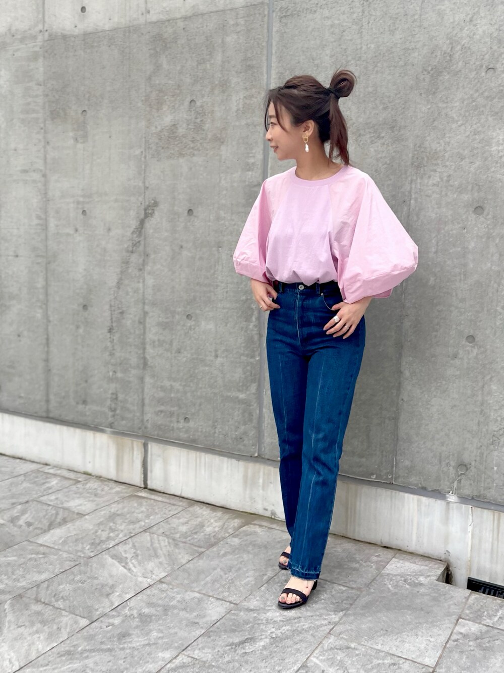 袖がポワンとしているブラウス。袖の部分がブラウス布、身頃がカット素材で異素材合わせがポイントのブラウスです。 青みピンクが初夏にぴったりな装いでデニムと合わせてみました