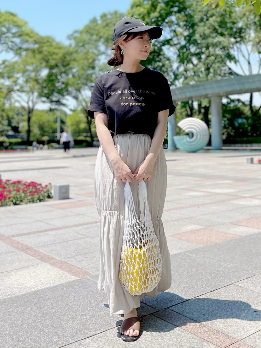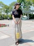 大人カジュアル ロゴTと、切り替えがポイントのギャザースカートは、コットン素材で涼しく着れます。夏のイベントにもオススメです。